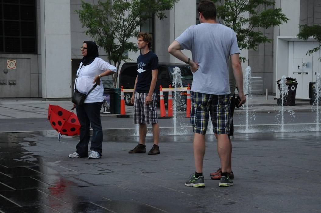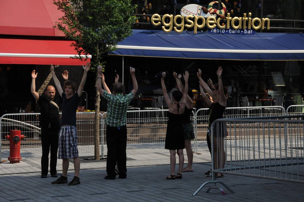 Un petit groupe d’individus, sous l’impulsion de l’artiste Anne-Marie Ouellet, s’est donné pour mandat d’expérimenter l’espace public. Arborant le même uniforme, un simple t-shirt aux couleurs du projet Secondes zones, ce groupe a cherché à tester les différents usages de la place des Festivals, cette figure emblématique du Quartier des spectacles. Ils ont ainsi adopté différentes postures, tantôt assimilables aux usages suggérés, tantôt légèrement décalées par rapport à ceux-ci, pour mieux questionner cet espace qui participe de ce grand projet d’aménagement et de revitalisation du centre-ville de Montréal. Comment peut-on s’immiscer au sein d’un espace balisé conceptuellement par de grandes orientations et occuper par une programmation officielle (festivals, animations de rue, interventions lumineuses, etc.)? Quel est le degré de porosité de cet espace et sous quelles conditions peut-on s’y inscrire? Voici quelques-unes des interrogations lancées par le projet Secondes zones.Inaugurant le nouveau site de DARE-DARE, Secondes zones, se voulait un laboratoire ouvert, un groupe de recherche informel, pour expérimenter cet espace urbain dédié à la présentation de festivals et d’événements à grands déploiements. C’est mu par un questionnement sur la transformation des places publiques en espaces de spectacles, qu’Anne-Marie Ouellet a recruté, par le biais de communiqués, des volontaires pour participer à son projet. Dix-sept personnes au total, provenant d’horizons différents, ont répondu à l’appel, prenant part dans la majorité des cas à plus d’une action. Si la première action a été proposée par Anne-Marie Ouellet, les trois autres actions ont été élaborées en groupe lors de rencontres préliminaires en petits comités, pour être ensuite proposées et retravaillées par l’ensemble des participants avant chacune des actions. Une seule consigne dictée par l’artiste a prévalue pour l’ensemble des actions: celle de ne pas parler. Les participants ne devaient pas se parler entre eux, ni répondre aux interrogations des passants. Si une telle éventualité se produisait, les participants devaient simplement remettre une carte présentant la citation : « L’utilisation de l’espace public est un privilège et non un droit » ainsi que les adresses web du Quartier des spectacles et celle du projet. C’est en furetant sur le site web du Quartier des spectacles, qu’Anne-Marie Ouellet a été interpellée par cette affirmation que l’on retrouve dans un document intitulé : « Demande d’occupation des espaces publics du Quartier des spectacles »[1]. Une phrase qui privilégie clairement une certaine conception de l’espace public et est qui fort révélatrice des enjeux qui sous-tendent l’espace public actuel.