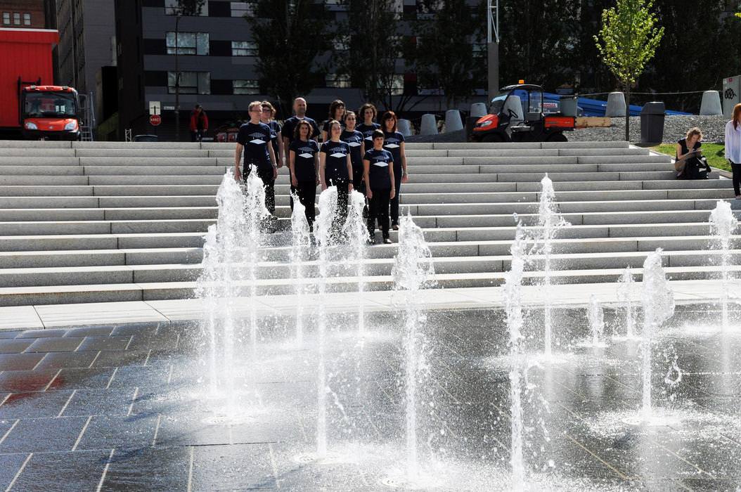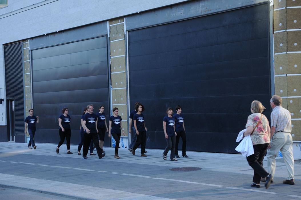 Action 1Ces usages ont été expérimentés de diverses manières par les participants de Secondes zones. Des actions qui ont été réalisées dans le contexte particulier des manifestations étudiantes contre la hausse des droits de scolarité, qui ont mené à des revendications sociales plus larges de la part des citoyens de tous âges, lors des manifestations aux casseroles. C’est donc à quelques heures des résultats de votes de l’Assemblée nationale de la Loi 78, qu’a eu lieu la première action de Secondes zones lors de laquelle les participants ont cherché à s’approprier et à expérimenter l’espace, qui n’était occupé à ce moment par aucun événement. Arrivant sur le site chacun de leurs côtés, les participants se sont assemblés peu à peu pour former un cercle, reprenant ainsi la forme centrale des fontaines. Ils ont ensuite déambulé dans l’espace deux par deux, avant de se regrouper quelques minutes sur les différents paliers d’un escalier faisant face à la place des Festivals. Puis, à la file indienne, ils ont quitté le site. Une action ténue qui leur a permis d’expérimenter non seulement l’espace mais également, les principaux axes du projet, notamment l’effet de groupe, la visibilité et l’anonymat. En arborant la même tenue, les participants de Secondes zones créent des rappels visuels, des motifs dans l’espace lorsqu’ils sont rapprochés, alors qu’ils retrouvent leur anonymat et leur individualité lorsqu’ils marchent seuls, ressemblant à n’importe quel autre citoyen. Une visibilité de groupe qui amène non seulement une cohérence visuelle mais qui alimentera également au fil des actions un sentiment d’appartenance qui a facilité, aux dires de certains participants, l’intervention dans l’espace public. Cette action se joue aussi de la réceptivité et de l’attention que les passants et les individus présents sur le site ont par rapport à leur environnement. Les participants cherchaient, lors de cette action, à simuler le début d’un événement ou d’une animation alors que rien ne se produisait, la chorale demeurant muette. Ce sentiment de déception, d’interrogation inassouvie est souhaité par Anne-Marie Ouellet et est au cœur du projet Secondes zones.
