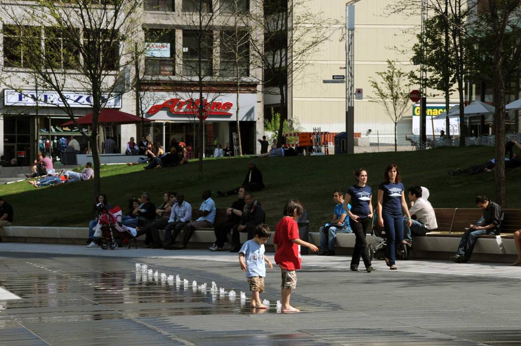 La place publique montréalaiseDans le contexte montréalais, la place publique a subi de nombreuses transformations au fils du temps, de la proto-place montréalaise, qui constituait le lieu d’échange commercial et social, accueillant le marché à foin et les institutions religieuses et politiques, à la place quadrangulaire classique, en passant par le square d’origine britannique. À partir des années soixante, avec le passage de ville à métropole, la plaza fait son apparition sur le territoire montréalais, dans la nouvelle vague de thématisation de l’espace qui influence aussi la construction d’une place sui generis, la Place des arts.