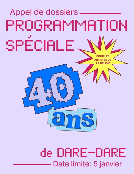 Pour célébrer les 40 ans du centre, DARE-DARE invite les artistes de la relève à proposer une action performative lors d’un événement festif et éclaté de 40 heures, qui se déroulera de façon continue pendant trois jours en 2026, du vendredi 27 mars à 20h au dimanche 29 mars à midi.