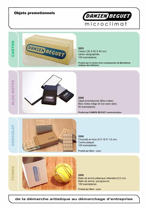 Sous l’appellation DAMIEN BEGUET micromat, Beguet se présente comme un entrepreneur et se réapproprie à des fins artistiques l’esthétique industrielle et les logiques de marketing. (logo, publicité, objet promotionnel, mascotte, sous-traitance, coproduction, parrainage, rachat de faillite, etc. …) Beguet a collaboré avec des entreprises comme le groupe d’hôtellerie Accor et avec la compagnie agroalimentaire Whaou. Dernièrement, il a acheté par contrat la signature, les archives et la production de Ludovic Chemarin (artiste qui a cessé sa pratique en 2005) afin d’obtenir la licence d’exploitation exclusive de l’oeuvre de ce créateur.