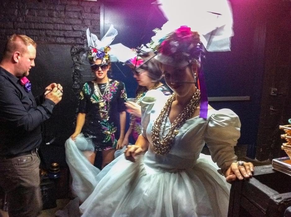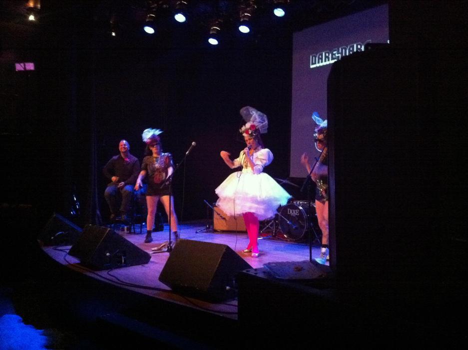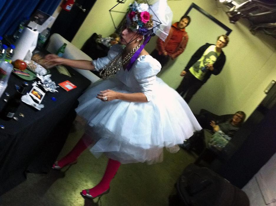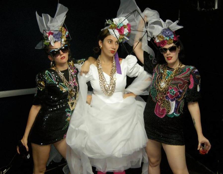 Compulsive et excessive, Violette Vilaine collectionne les passe-temps et les alter-egos de la même manière qu'elle collectionne les objets. Dans le rôle de Donzelle-, elle est ridicule et prétentieuse, armée de talons hauts dorés, d'un décolleté plongeant, de métaphores bancales mais surtout de collaborateurs compétents. Soutenue sur scène par ses danseuses " Janet Jackson-esques ", elle a pour mission de vous faire danser comme s'il n'y avait pas de lendemain ! Photo : Julie Artacho