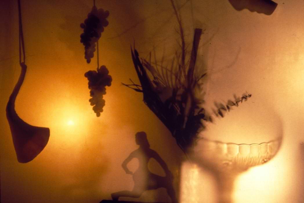 Dans cette installation, l’artiste a disposé divers objets que la lumière fait briller de l’intérieur et qui créer de l’extérieur un théâtre d’ombres.