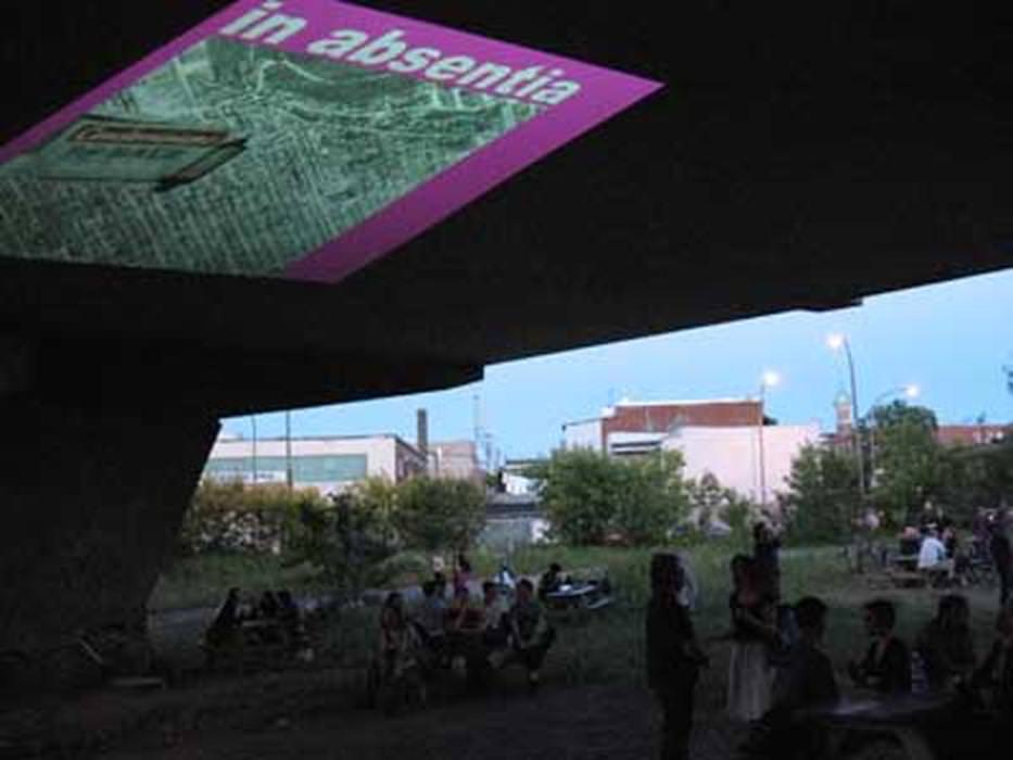 In absentia marque également la fin du présent volet de Dis/location: projet d’articulation urbaine – ainsi que de la présence de DARE-DARE dans le parc sans nom du Mile-End. La roulotte quittera le site inoccupé où elle était établie depuis deux ans, en route pour le square Cabot au centre-ville de Montréal, à l’angle de Ste-Catherine et Atwater.