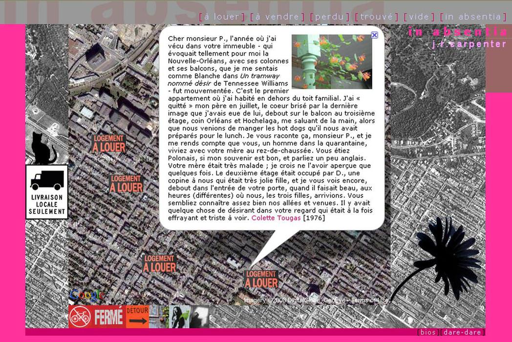 In absentia est un projet d’écriture sur le Web qui traite de la gentrification dans le quartier Mile-End de Montréal et des disparitions qu’elle entraîne. J.R. Carpenter utilise le HTML, DHTML, le JavaScript et les cartes API-Google pour créer une narration interactive non linéaire constituée d’histoires « cartes postales » écrites selon le point de vue d’anciens locataires du Mile-End forcés de quitter leur logement à cause de la gentrification. Le projet débutera le 24 juin et se poursuivra au cours de l’été et de l’automne 2008. Pour réaliser In absentia J. R. Carpenter a invité les auteur.e.s : Lance Blomgren, Andy Brown, Daniel Canty, Alexis O’Hara, Colette Tougas.