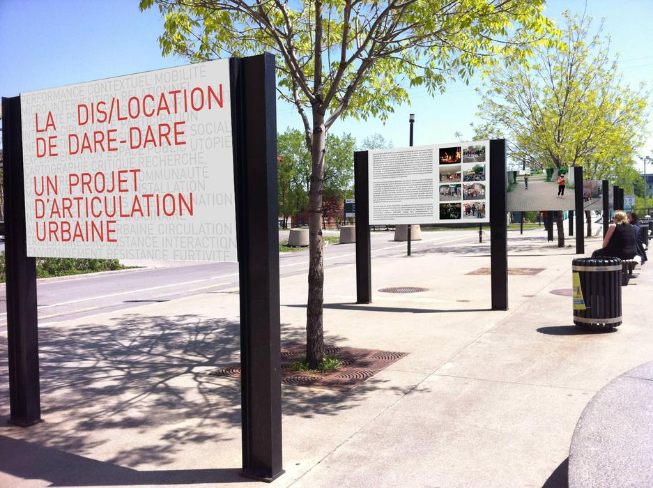 L’exposition La DIS/LOCATION DE DARE-DARE propose un survol rétrospectif sur la première décennie du projet d’articulation urbaine que mène le centre depuis 2004. Cette année là, avec l’objectif de promouvoir la diversification des modes de présentation des œuvres et des interventions artistiques, DARE-DARE a pris la décision de rendre tangible la réflexion menée depuis plusieurs années par ses membres sur les démarches d’appropriation de l’espace public en art actuel. Dès lors, le centre a entamé un projet expérimental de positionnement dans la trame urbaine en quittant la galerie de la rue Sainte-Catherine pour s’installer dans un abri mobile. Ce déménagement visant à implanter plus radicalement DARE-DARE dans l'espace public de la ville de Montréal, s’inscrit dans le cadre du polyptique Dis/location : projet d’articulation urbaine dont le premier volet a débuté avec l'installation de cette roulotte de chantier au square Viger. Depuis, ce quartier général de DARE-DARE migre d’un quartier à l’autre, pour effectuer cette exploration par amarrages successifs de deux à trois ans en des lieux porteurs de riches questions d'ordre social, politique, historique ou urbanistique.