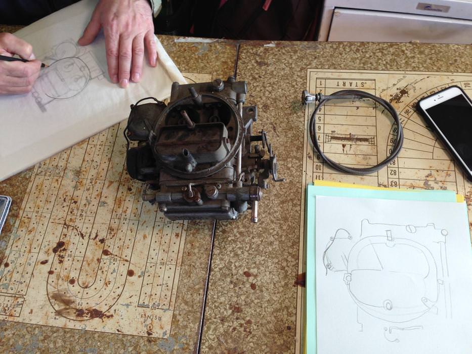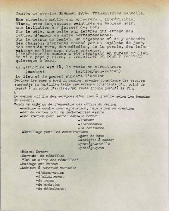 Grumman 1974. Transmission manuelle. Une structure mobile qui encadrera l'imprévisible. Blanc, avec des espaces peinturés en tableau noir; une invitation à y laisser des mots.