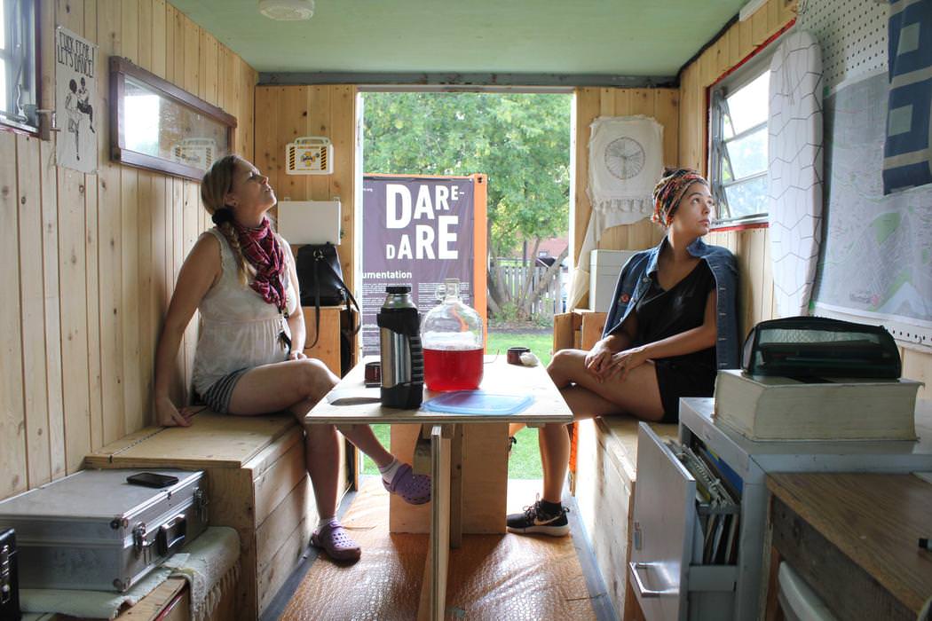 L'intérieur du camion a été réaménagé en bureau et lieu de vie pour y vivre, y travailler ou pour y recevoir quiconque à bord.