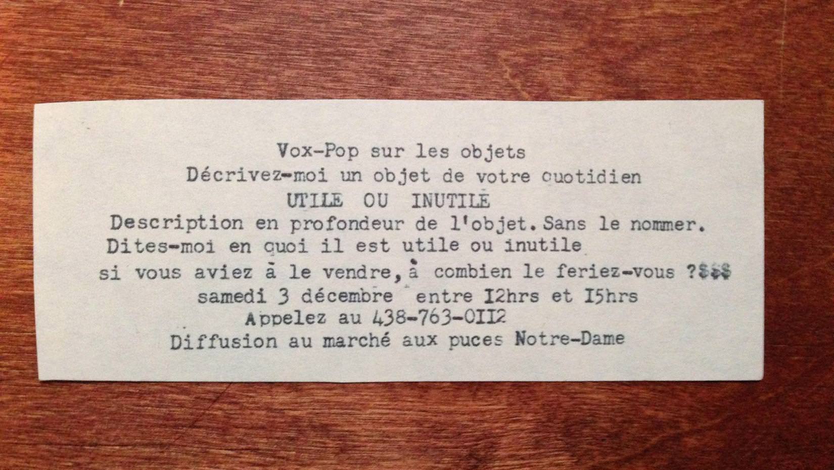 VOX-POP au marché aux puces Notre-Dame,VOX-POP au marché aux puces Notre-Dame. Je ferai une "vox-pop mobile" sur la thématique « Objets du quotidien ». Je serai sur place avec mon camion, pour faire la diffusion des appels. Thé offert sur place.