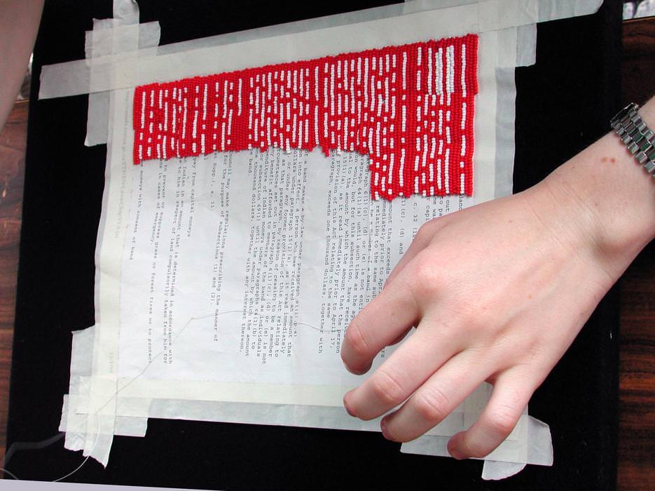 À travers la démarche artistique attentive de Nadia Myre, qui reprend la technique traditionnelle du perlage pour oblitérer le texte de la Loi sur les Indiens, une révélation s'actualise et jette un éclairage radical sur le clivage entre l'intention légaliste et la réalité.