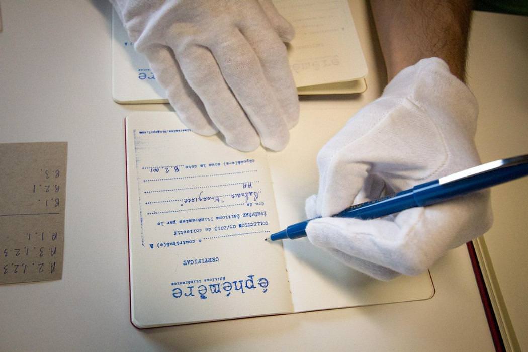Concernant l’échange tangible et la collection du quotidien, ÉPHÉMÈRE ÉDITIONS ITINÉRANTES, situés près de Vox, toujours dans le 2-22, construisaient leur COLLECTION 05/2013, composée d’offrandes faites par les participants. Les deux artistes, SANDRINE BRIAND et FRANCYS CHENIER, recueillaient divers objets trouvés dans nos fonds de poches : des plectres de guitares, gommes à mâcher, vieux billets de théâtre, et autres objets plus ou moins intéressants. Par la suite, ils étaient classés selon une cote bien précise, inspirée par la commission Charbonneau apprenait-on de manière ludique, notant leur taille, leur rang ainsi que la section de la boîte où les petits objets sont maintenant entreposés.