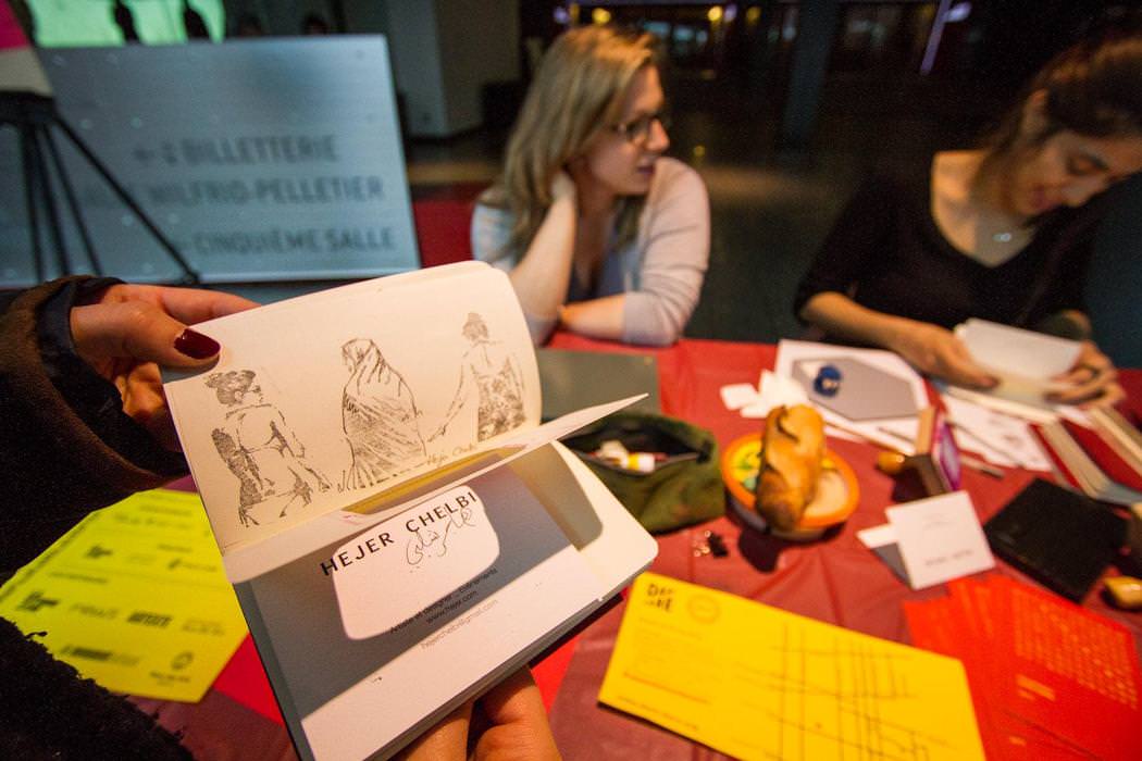 Au Monument National, ÉTIENNE CHARTRAND nous dessinait ce qu’on lui demandait, marquant son penchant pour les dessins comiques de dinosaures, créatures qu’il considère étant de grands absents dans le monde pictural. Le parcours se terminait pour moi à la Place des Arts avec HEJER CHELBI, traitant de la relation médiatique envers le printemps arabe et son comportement de cadrage. Une étampe de téléviseur où le centre est découpé laisse apercevoir une partie de la page suivante, montrant une femme voilée, mais dissimulant deux filles en maillot de bain.