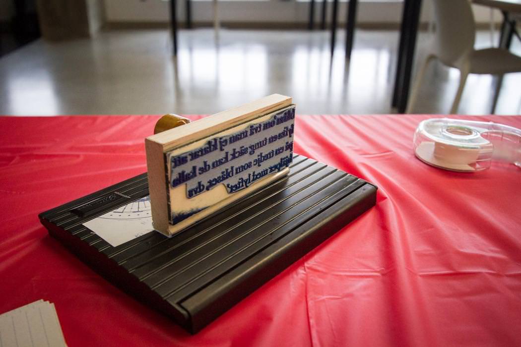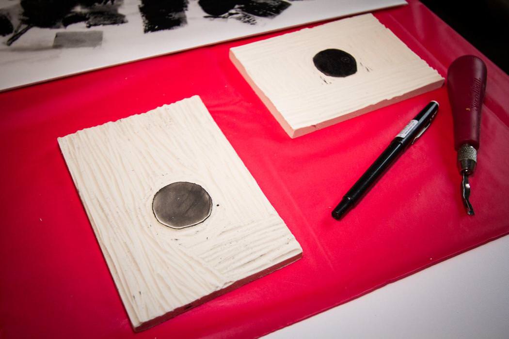 Au complexe 2-22, à la Vitrine, avec EMMANUEL LAFLAMME, qui nous offrait un Fan Art auto-dérisoire composé d’une étampe d’éventail (fan) giclant de la vraie peinture sur une toile expressionniste abstraite (art), on discutait de techniques d’animation traditionnelles en opposition à celles faites par ordinateur; on tergiversait aussi de la production locale en matière de design et de communications; et on se rappelait les dessins de Walt Disney, l’art de Jackson Pollock, celui d’Andy Warhol, de Keith Haring et de Banksy. Toujours dans la personnalisation des œuvres, CAROLINE BLAIS, alias CHOCOBEETS, nous faisait choisir une lettre, majuscule ou minuscule, quelle découpait à la main dans du vinyle autocollant de la couleur de notre choix. Elle nous marquait ainsi son admiration pour la typographie, bien campée dans la librairie Format. MARILYN CHAMPAGNE marquait sa trace d’un point lunaire, poursuivant les recherches de son père sur les éclipses. De son côté, JACINTHE ROBILLARD profitait de l’événement comme prétexte à échanger son étampe d’origami, trace d’un projet passé, contre la prise d’une photographie de notre visage pour un projet futur.