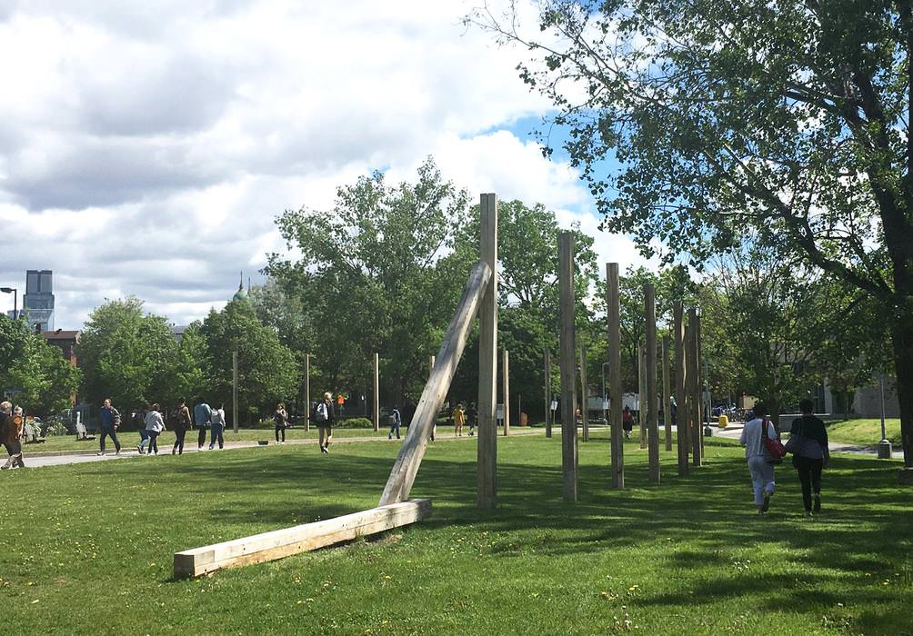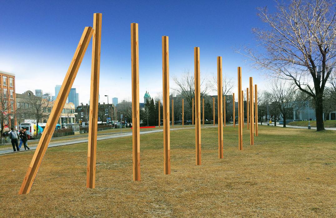 La métaphore de la forêt tient dans la verticalité de l’œuvre et par les matériaux bruts employés, mais également dans la notion de passage et de parcours. Les usagers des transports en commun sont en mesure de constater de l’ensemble de l’intervention qui se déploie devant eux en la traversant et du même coup pour apprécier les détails d’assemblage de chacun des arbres. Il s’agit à la fois d’une œuvre d’envergure qui se contemple dans les ses moindres détails, tout en étant près de l’échelle humaine.