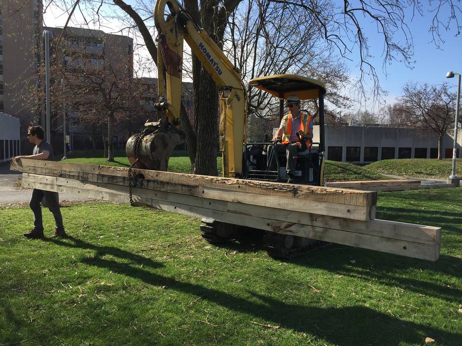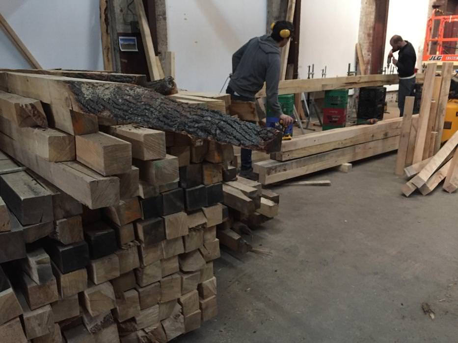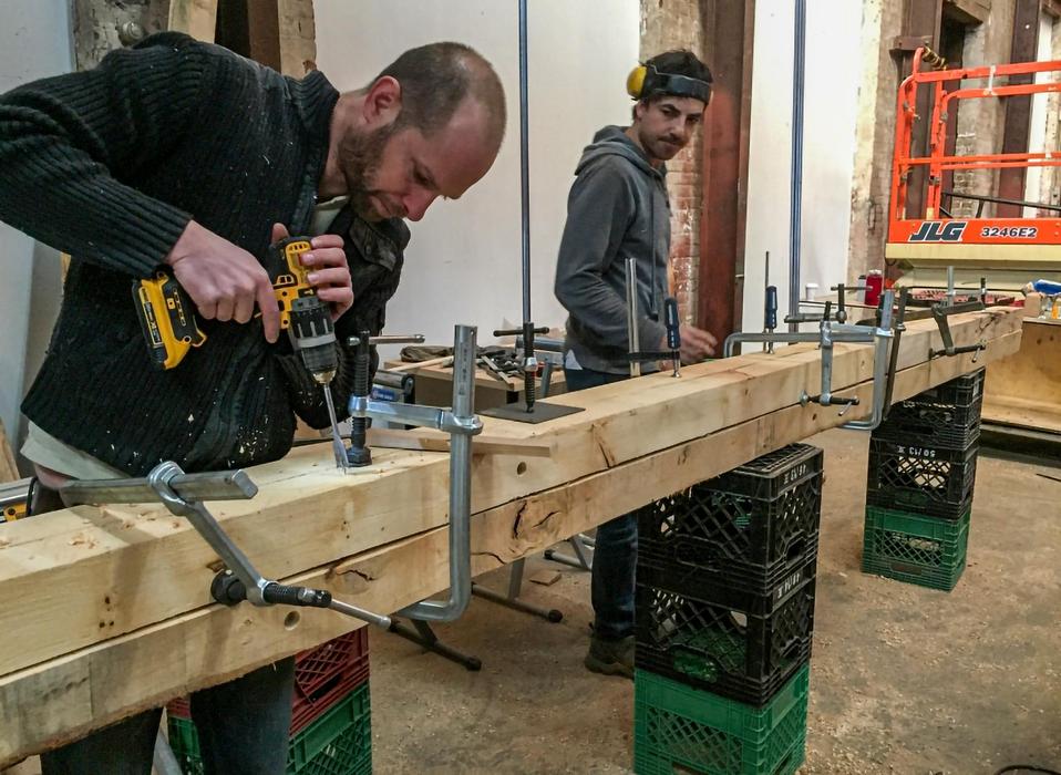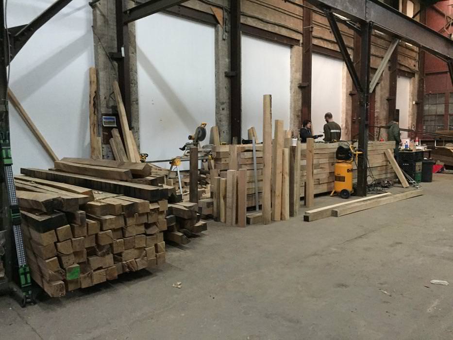 Suite à la livraison des sections de bois prédécoupées et séchées de 4 pouces par 4 pouces fournies par l’arrondissement, l’artiste Philippe Allard et ses alliés se sont mis au travail. La quantité de bois nécessaire pour fabriquer Freiner la chute représente plus de 2000 pieds linéaires de bois coupés l’année dernière, séchés dans un séchoir pendant 4 mois, soit l’équivalent de 1 pouce linéaire par mois de séchage. Il s’agit de plusieurs essences de bois. En plus du frêne de Pennsylvanie, l’œuvre est composée de tilleul à petites feuilles, érable argenté, érable de Norvège et de Chêne rouge.