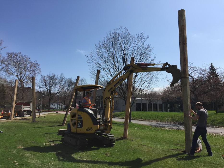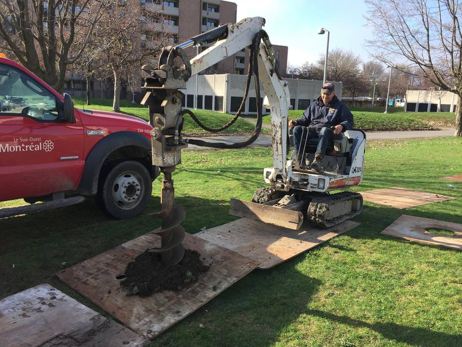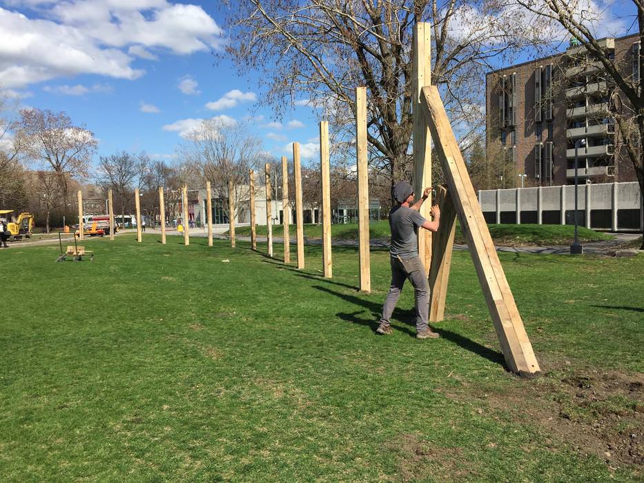 Suite à la sélection par le centre de diffusion d’art multidisciplinaire DARE-DARE, l’artiste Philippe Allard propose Freiner la chute, une œuvre éphémère monumentale. Cette œuvre pensée spécifiquement pour l’appel de projets lancé par l’arrondissement Le Sud-Ouest, agit dans une lignée se rapprochant du land art. Par ce geste artistique fort et sans équivoque Freiner la chute crée un lien direct avec la problématique envahissante de l’agrile du frêne.