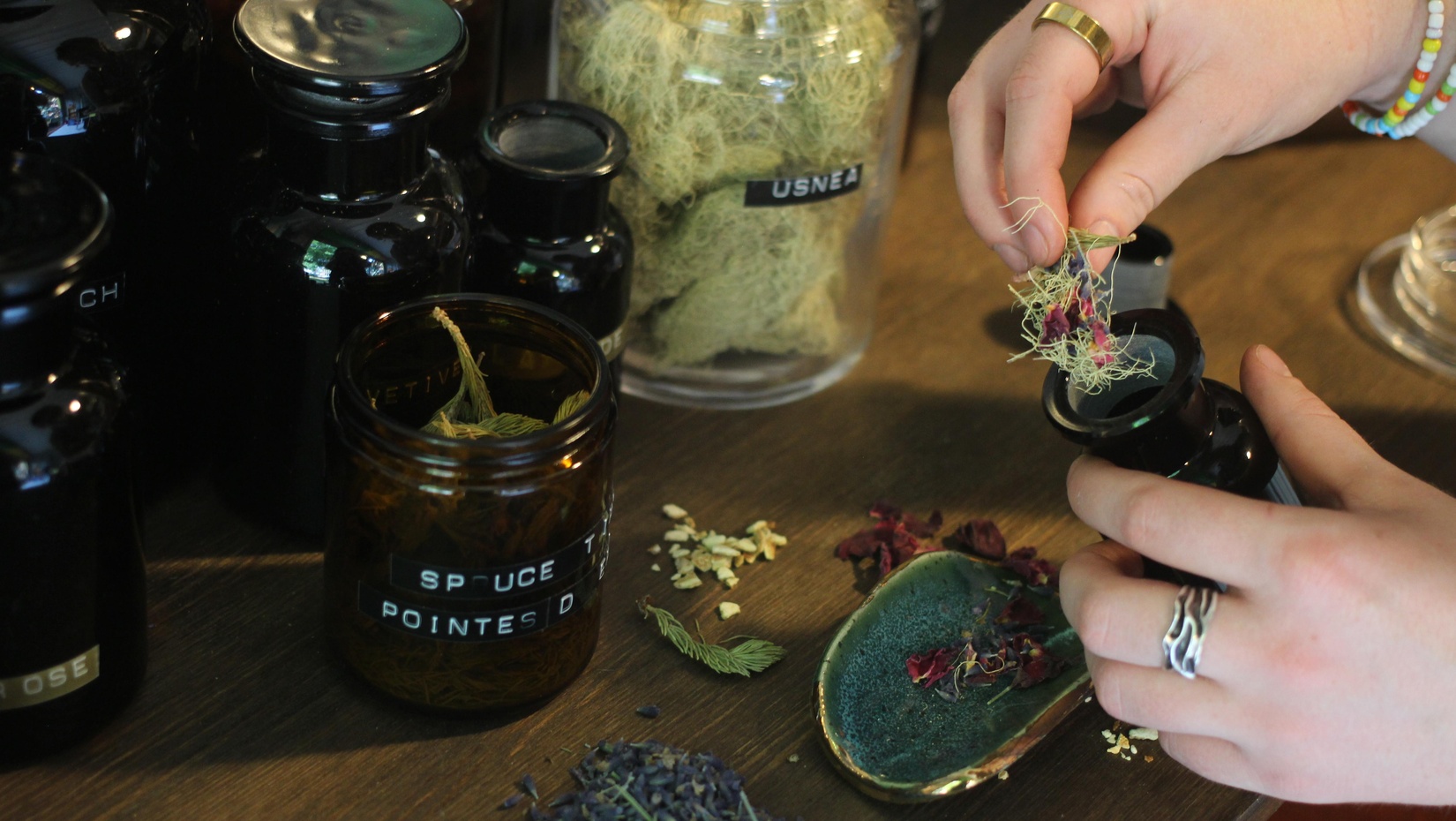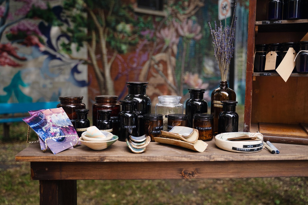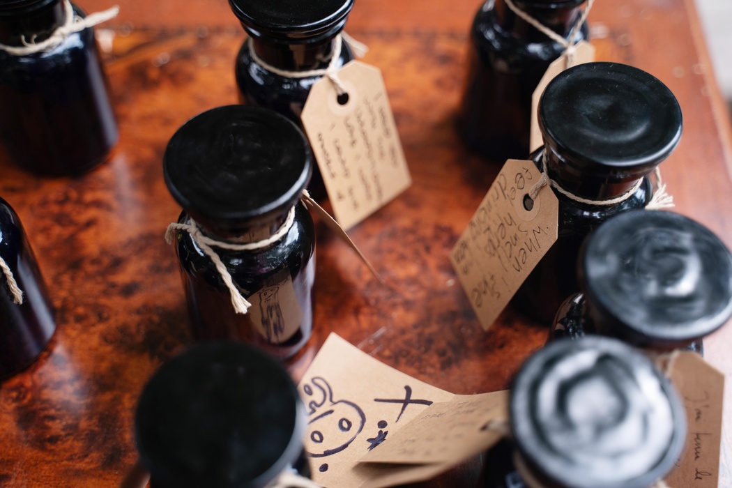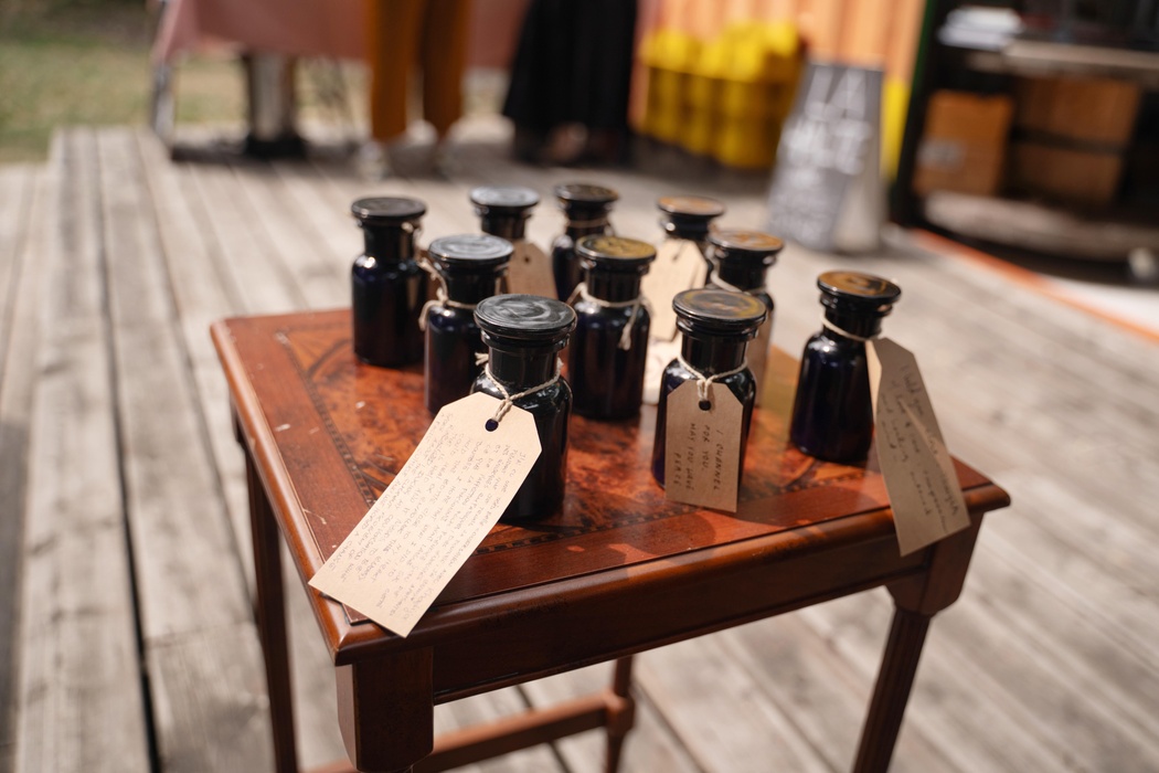 Les visiteurs seront invités à remplir une bouteille d'apothicaire avec une combinaison de matériaux, à la sceller et à la ranger sur une étagère. Ils prendront en échange une autre bouteille remplie et suivront une série de pistes de réflexions pendant qu'ils la tiennent et la remettent en place.