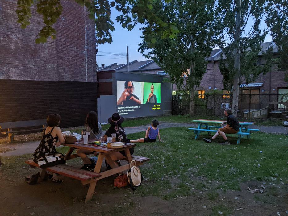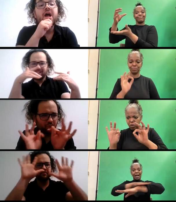 Le dramaturge Wojtek Ziemilski et le poète et acteur sourd Adam Stoyanov, qui favorise dans son travail la langue des signes polonaise, ont conçu en collaboration une œuvre vidéo (44 min) intitulée « Signes communs/Znaki Wspólne ». Le projet vise à mettre en valeur la langue des signes, qui est souvent négligée lorsque l’on parle de diversité culturelle et des minorités. Ils ont rencontré la poète et artiste sourde Hodan Ismaël Youssouf, qui utilise la langue de signes québécoise, afin de créer un poème à partir de ce que les deux artistes peuvent comprendre ensemble, ou mal comprendre. C’est un poème construit en connectant les deux langues, les deux cultures locales, les différences et les similitudes à chaque un, dans le but ultime de créer un.e langage commun.