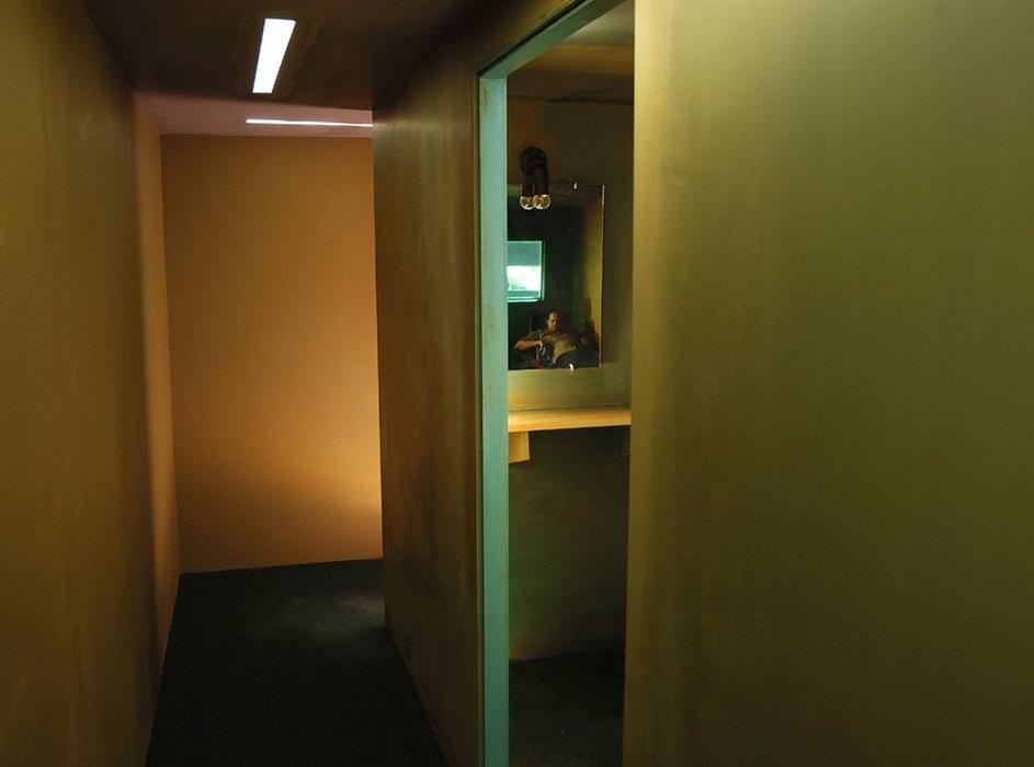 A container. A structure that at first glance appears to be a closed box. However, through an opening, the box reveals a reduced model of a corridor. At the end, a door is half-open on a room. Simply furnished, the room hides a character sitting on a chair. It is not clear what he is examining, but he seems to be observing the audience who is watching him. He even seems to be annoying the gallery visitor. The sculptural installation presents an investigation of light and perspective, an exploration of the inertia/anticipation continuum, while investigating the concept of the non-place and the invisible in the work. The site-specific installation integrates video, sculpture, design and architecture.