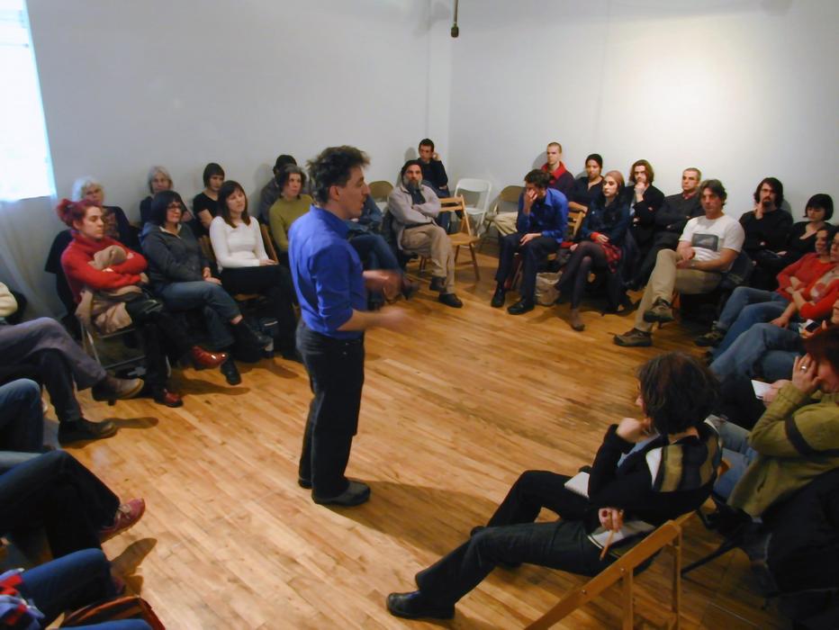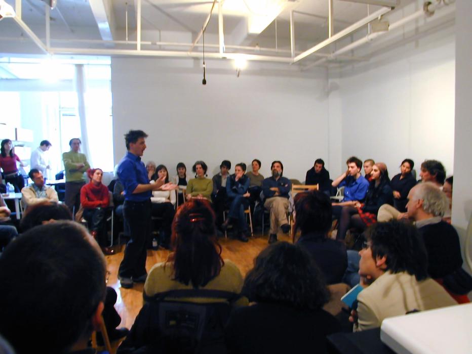 This forum explores the idea of community in the context of recent developments in infiltrating practices, intervention practices, contextual and relational art, practices inscribed in the zones of real life. Archetype, concept or experience, the idea of community appears as a common denominator to all these practices. Attempting to define community and to validate the relationship that artists have with it in their creative processes, identifying the aesthetic and ethical values that animate the infiltrating practices, by considering the issues that characterize them, such are the stakes of this meeting.The event was held Saturday, March 20, 2004 at 1:30 pm 460 Sainte-Catherine Street West, space 505, Montreal.