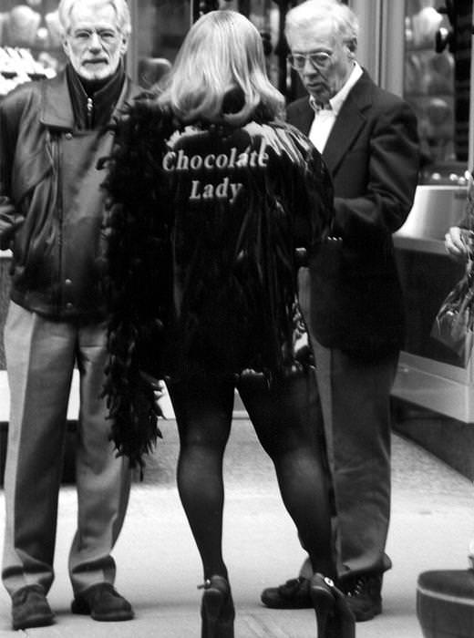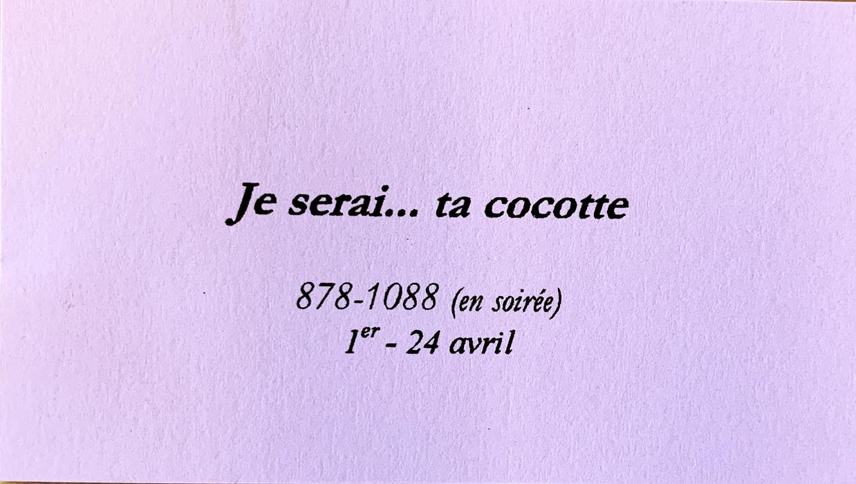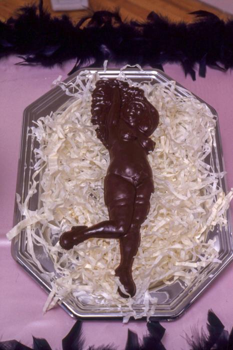 Christine Lebel's (aka Chocolate Lady) Montreal exhibition/performance played on the ambiguities between chocolate and sexuality, the artist and the character by making DARE-DARE a place for consumption. She wisely chose to have her chocolate opening at Easter. The cocotte in question is her own body that she molded, poured in chocolate, broke up and wrapped. It was distributed and sold to the highest bidder at an aphrodisiac auction. During the exhibition, she made several trips to the street at lunchtime. Dressed in stilettos and a black raincoat, the Chocolate Lady handed out business cards that read Je serai... ta cocotte and the telephone number of DARE-DARE, piquing the curiosity of passers-by and leaving doubt about the merchandise offered.