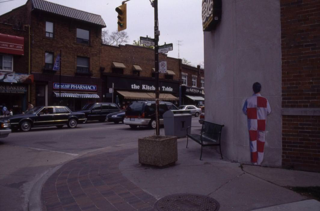 In addition to offering the public a direct experience of the work in the street, this project simultaneously presented the artist's research space at DARE-DARE. The key element was a series of identical silhouettes arranged on the Place des Arts esplanade: the artist seen from behind, wearing a red-and-white-checked suit and carrying a cell phone to his ear.