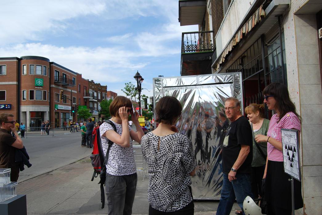 Using the framework of the Ontario Promenade sidewalk sale, Dominique Sirois continues to research presentation models inspired by the kiosk form. In one way, this installation presents a set of interlocking shapes and reflections: a deep-seated layer of containers and packaging enveloping its structure and exploring the subtleties between merchant and museum displays. In another way, it is a presentation about nuclear energy, fictitious and utopian, worthy of conversation with activist dimensions. With this kiosk, Sirios is exploring the “vacuum” in material terms while also voicing the hidden dangers posed by nuclear energy, as in the recent disaster in Fukushima. An installation intervention, through the presence of Sirois, diverts the real context of a wholesale sell-off for artistic purposes.