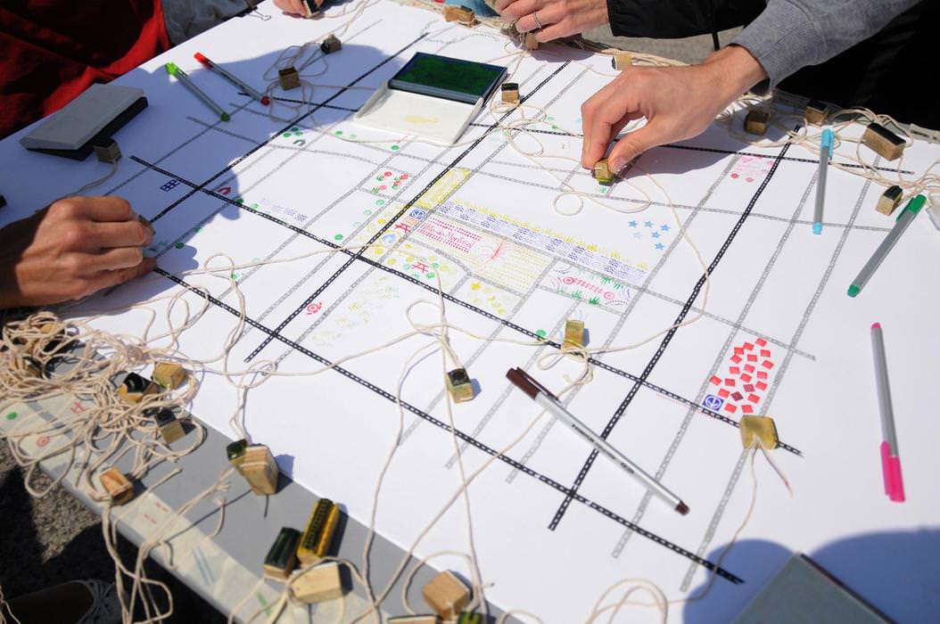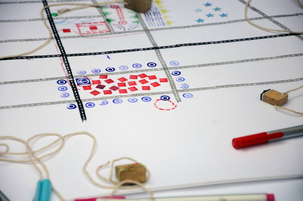 These stamps constitute a legend, an alphabet that participants can appropriate to represent their personal territory. My equipment, rough-and-ready, fits into a bag. Because the workshops are intended for a general public, participants feel sometimes uncomfortable to perform the act of creation. But printing with stamps is fun, spontaneous and compulsive. The gesture, hesitant at first, quickly turns into a creative impulse. The map becomes the framework for a succession of stories, anecdotes and narrations; a pretext to connect with people while thinking about the way we occupy, cross, appropriate and share territory — and the ways to reinvent it.