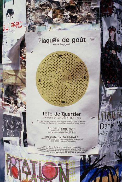 The Plaques de goût project by the artist Franck Bragigand consists of painting the lids of the sumps situated in the neighborhoods surrounding the park with no name where DARE-DARE took up residence in July 2006. These doors of the Montreal subway where are the electrical wires and Telecommunication cables, where the natural waste and human trash flow, are nevertheless opened every day by people whose job it is to open them.