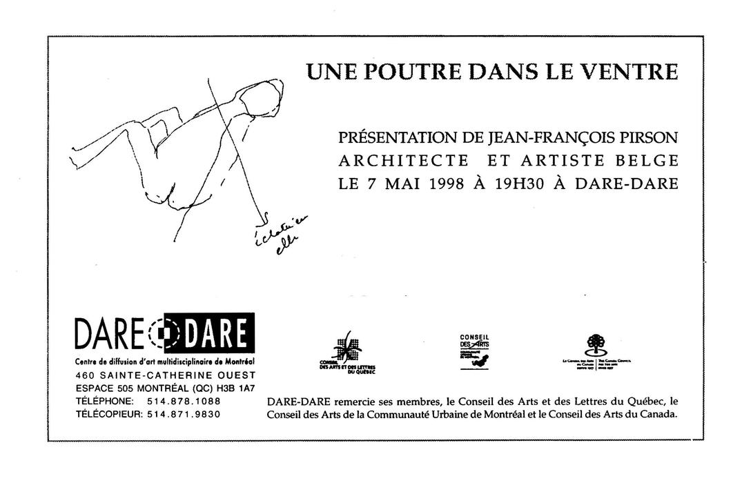 While in Quebec, DARE-DARE invited Belgian artist/theorist/educator Jean-François Pirson to share his poetic reflections on the relationship of the body to "the architecture of the everyday".
