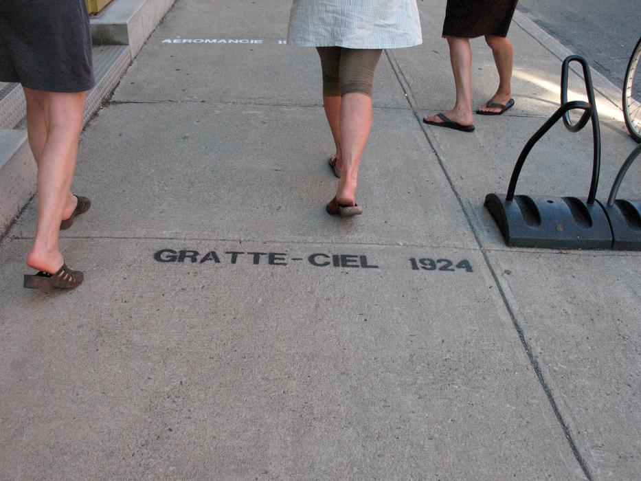 Les Mots is an urban intervention project presented by Julie Faubert as part of DARE-DARE’s 2010-2011 programming. It brings together over 125 phrases that use dated* - archaic (1900-2000), added (1900-2000) and invented (2010) words. The sidewalks of Quartier des Faubourgs will become the pages on which her sentences will unfurl, mirroring the rhythmic movement of each passersby.