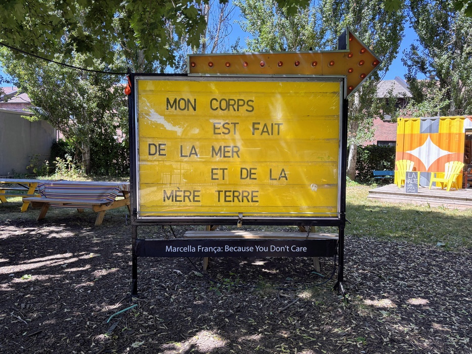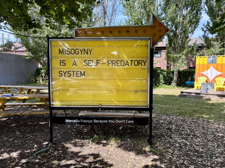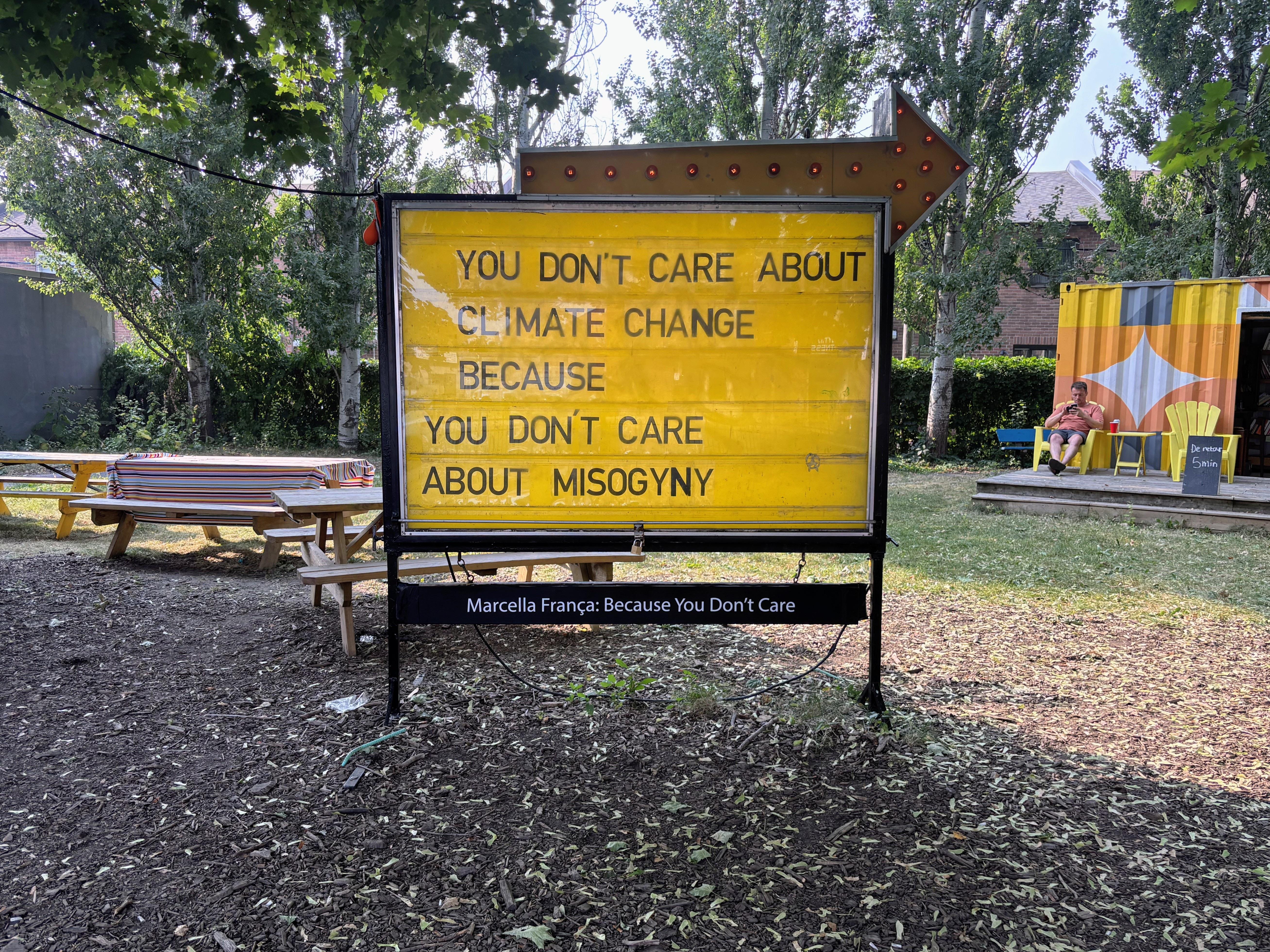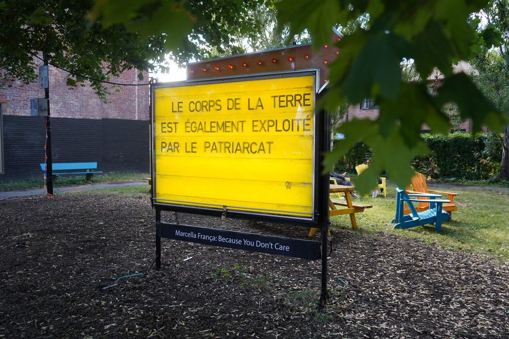The BECAUSE YOU DON'T CARE project proposes the installation of 12 phrases—6 in French and 6 in English—in the urban space of southwest Montreal, an area marked by its bilingualism and social diversity. These statements aim to challenge passersby on the deep connections between colonial extractivism, the climate crisis, and systemic misogyny.