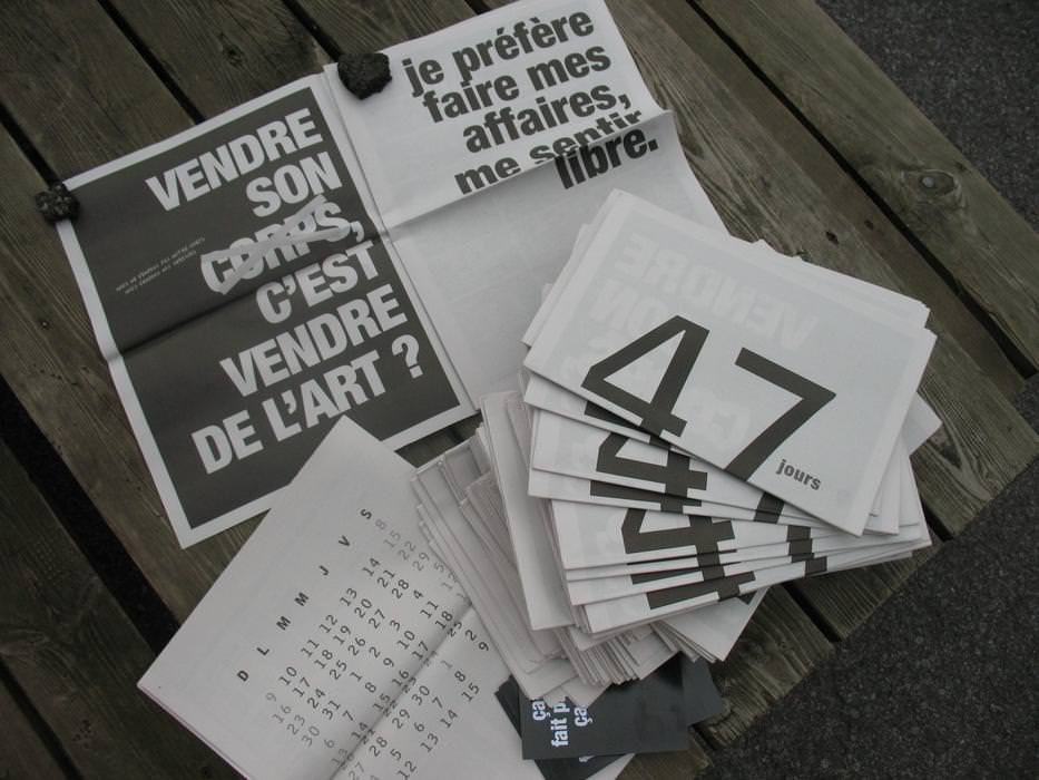 The project, entitled 47 jours (47 days), questions the role of the artist and the existing censorship within contemporary art practice. The projects of Miquel Garcia Membrado explore direct social intervention and micropolitical activist strategies strategy to present stories of everyday life. Exploring the limits of his own practice, he proposes to work public space, artist residency and sex-work.