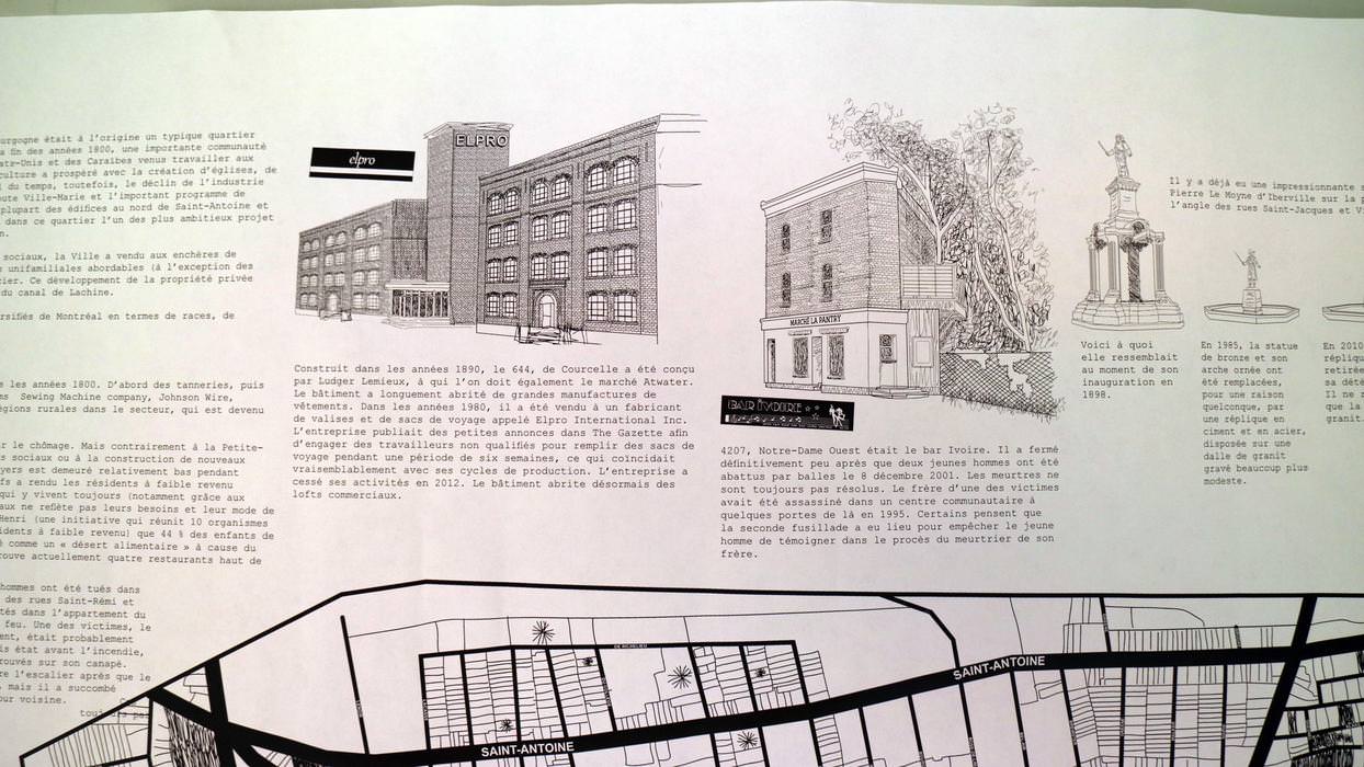 Among other projects, I am currently writing a series of zines titled True Tales of Intrigue, small booklets that tell short, powerful stories that people have told me over the years. Thanks to the support of the DARE-DARE artist center and motivated by your FRICTIONS theme, I am going to produce a specific issue on the district where you are currently: Sainte-Cunegonde/Little Burgundy/Saint-Henri. This zine offers a counterbalance to the shocking gentrification that, over the last decade, has transfigured the sector to the point of making it unrecognizable. I plan to broadcast this zine free in unlikely places in the neighbourhood so that this new generation of residents can acquire a more human knowledge of the district, an acquaintance that neither the Fancy Vintage bars (illuminated with Edison bulbs), nor a $12.00 speciality cocktail, nor the promotional signs of chic industrial condos can not transmit.
