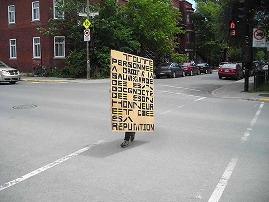 Dans movin‘ the charter, karen elaine spencer propose de disséminer dans l'espace public des extraits de la Charte des droits et libertés du Québec, qu’elle a retranscrit sur de grands panneaux de bois.