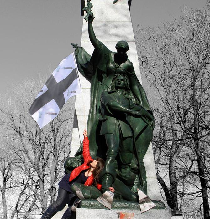 Noémi McComber’s interest in monuments and national emblems is through re-examining their place and pertinence in the face of today’s geopolitical and social realities. She will take over different historical monuments within the quartier des Faubourgs using performative interventions that play with the signs and symbols claiming to reflect and represent the collective and Quebecois identity of local communities. She will realise a series of interventions with the help of several collaborators, of reconfigured flags and of various accessories like nets, banners and badges. These actions will aim to put into question the characteristics of monuments: their placement, their reason for being and their historical significance. Thus, McComber will challenge these historical icons with new symbols from contemporary culture, Quebec folklore and local realities.