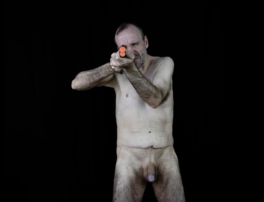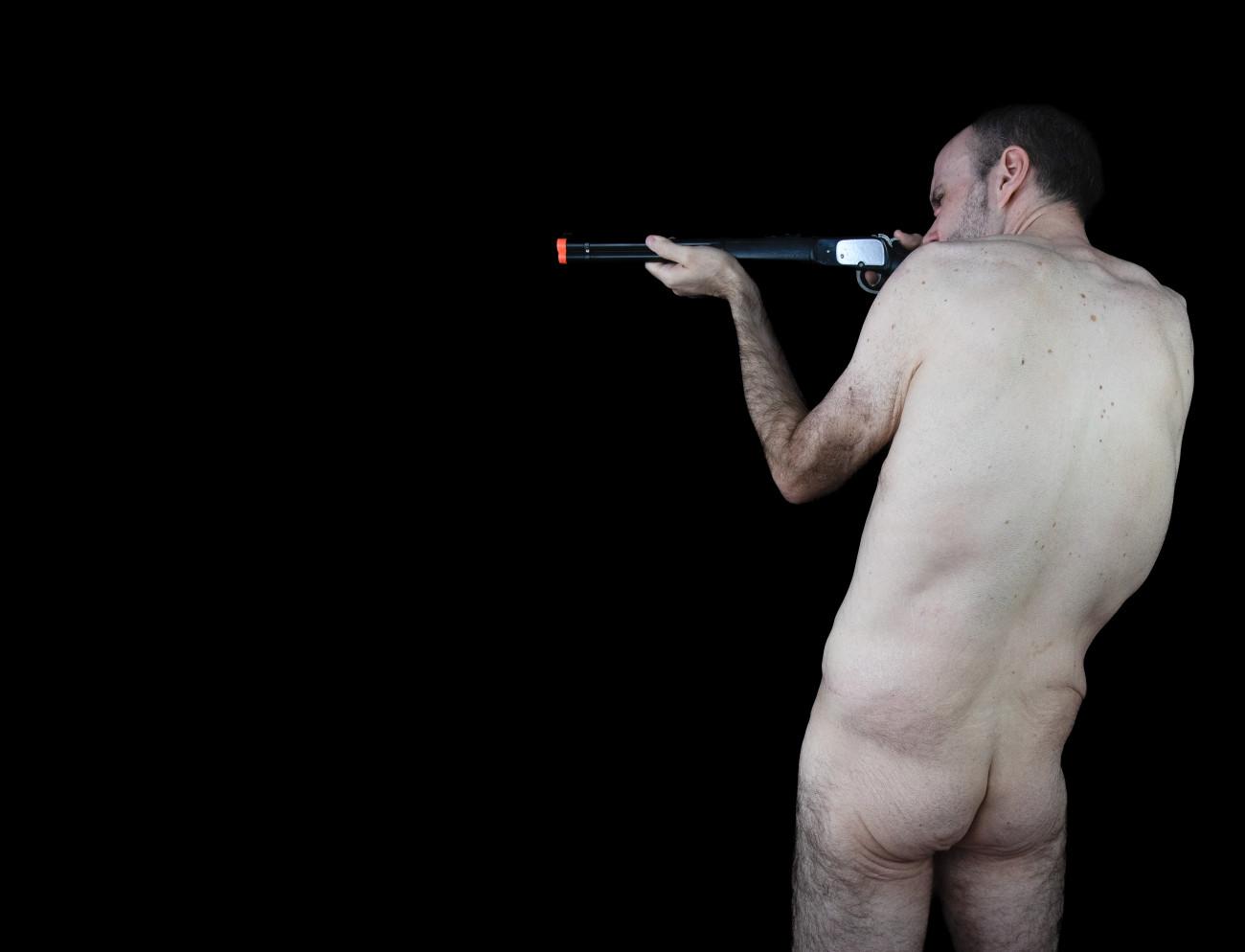 Steve Giasson. Invisible Performance No. 292 (Soliloquize). Reenactment of Ulay. Soliloquy (Shooting Self). 1972–1973 (Amsterdam, September). Performer: Steve Giasson. Photography credit: Martin Vinette. Photographic retouching: Charles-Étienne Lebrun. January 21, 2021. -