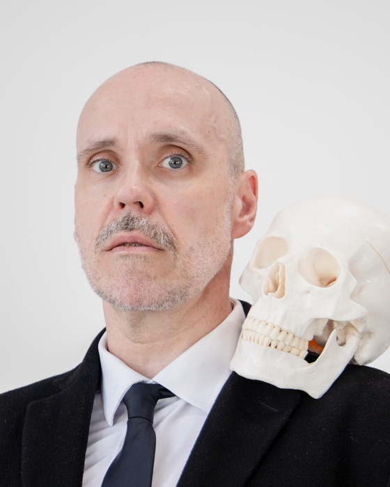 Steve Giasson. Invisible Performance No. 294 (Watching a Disaster (in Slow Motion)). After Andy Warhol. Self-Portrait with Skull. 1977. Performers: Steve Giasson and Martin Vinette. Photography credit: Martin Vinette. Photo retouching: Charles-Étienne Lebrun. Galerie B-312. August 2, 2025. -