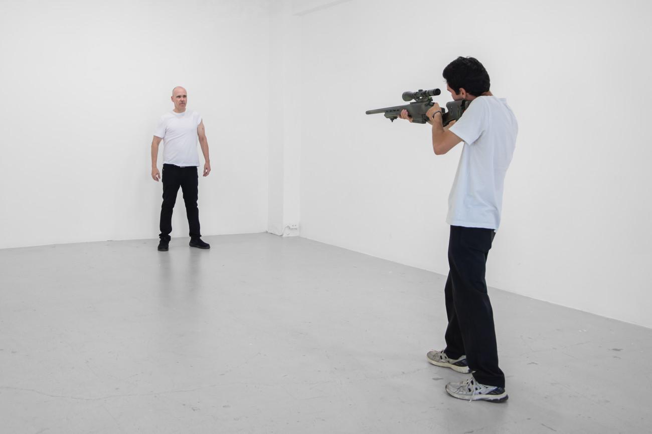 Steve Giasson. Invisible Performance no. 291 (Playing War). Reenactment of Chris Burden. Shoot. 1971. Performers: Steve Giasson and Félix Hould. Photographic and videographic credit: Martin Vinette. Photographic and videographic retouching: Charles-Étienne Lebrun. Galerie B-312. August 15, 2025.