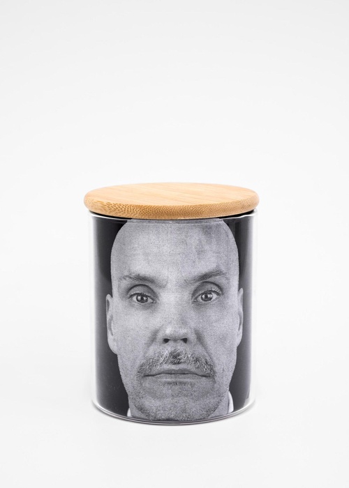 Steve Giasson. Invisible Performance No. 278 (Being One’s Own Commodity). After Marcel Broodthaers. Self-Portrait. 1966. After Marcel Broodthaers. Pot with Black and White Photograph (Self-Portrait). 1967. Photographic credit: Martin Vinette and Charles-Étienne Lebrun. Photographic retouching: Charles-Étienne Lebrun. June 15, 2025.