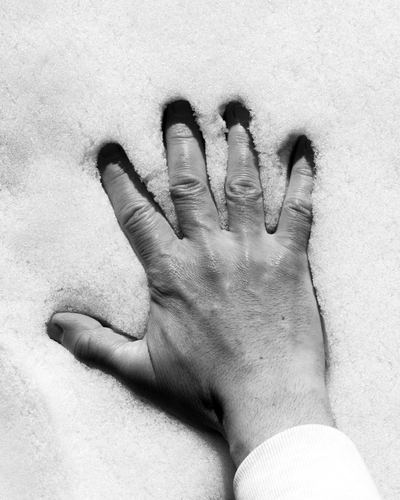 Steve Giasson. Invisible Performance No. 289 (Leaving a Mark (Despite Everything)). Reenactment of Michal Kern. Prvý sneh, prvý dotyk, prvá stopa [First Snow, First Contact, First Trace]. 1984. Performer: Steve Giasson. Photographic credit: Martin Vinette. Photographic retouching: Charles-Étienne Lebrun. February 21, 2024. -