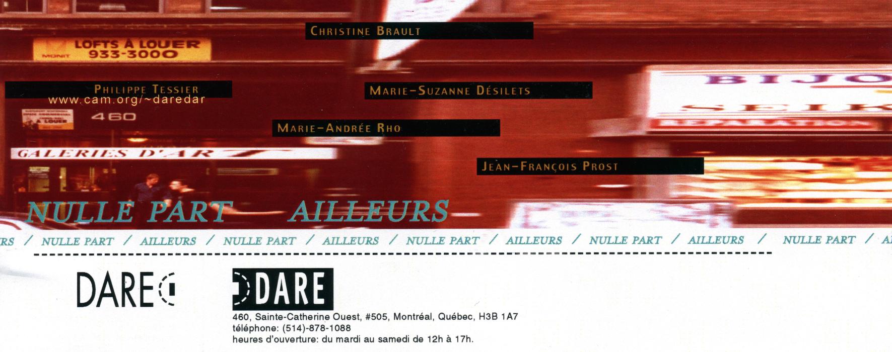 The artist is interested in the utopias conveyed by new communication media, particularly the Internet. In spite of, or precisely because, the Internet is such a new and potentially powerful communications medium, it has been designated as a new frontier to be colonized. The logical extension of these discourses has fostered the emergence of utopian thinking associated with the Internet. In this project, Tessier takes up old conventions that have evolved around notions of the utopian place and ultimately the Ideal City, now transposed into the Virtual City. The artist creates an installation in three times-three contexts based on a quotation from Montaigne. "He who is everywhere is nowhere", will be written fragmentarily in three spaces: the third fragment, "nowhere", will have a physical presence in the DARE-DARE gallery space. The letters of the words were fabricated (written) using 3' x 6' gypsum panels.