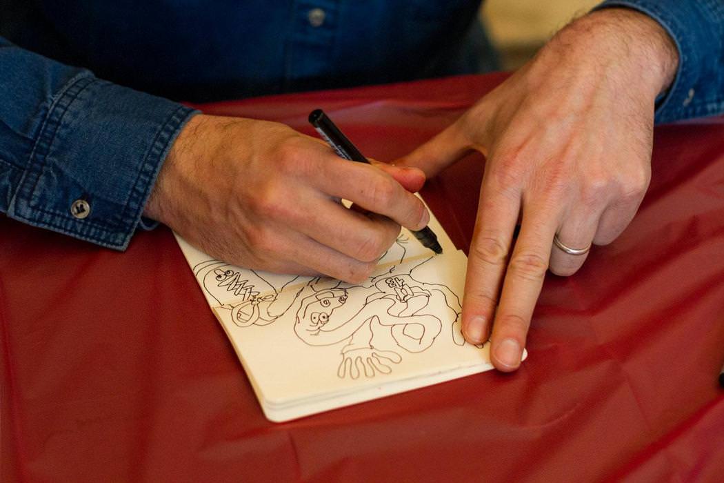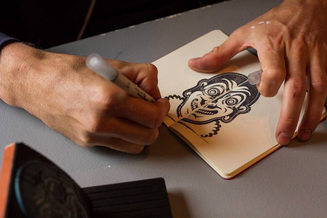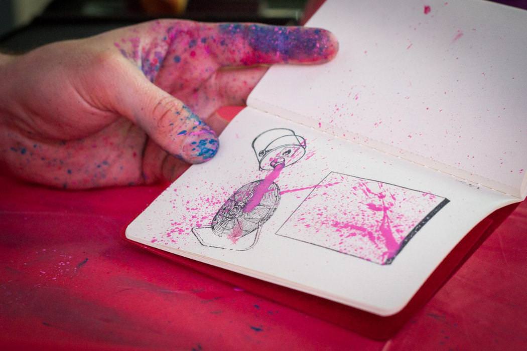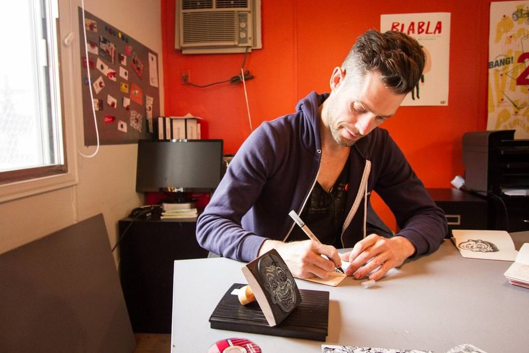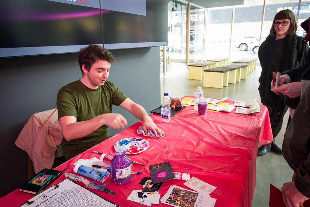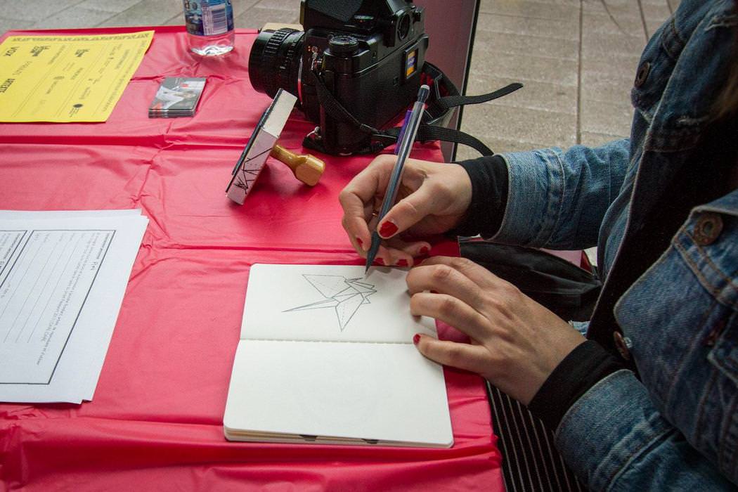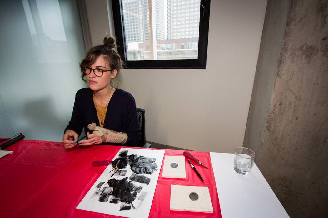 The fundraising evenings are meant to give opportunities to emerging artists studying in university (UQAM, Concordia), and self-taught street artists. In order to start this year's collection, three emerging artists, and two established artists have been selected to stamp their work during the fundraisers, a prelude of the work to come.