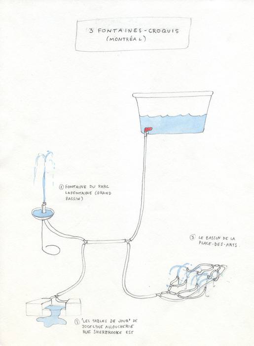 The travel sketch plays an important role for the artist. In Montreal, Sally Lee Sheeks made sketches of three fountains: the large fountain in the Lafontaine Park basin, Jocelyne Alloucherie's fountain sculpture Tables de jours, and the fountain basin in Place des Arts. Using plumbing and domestic materials, the artist has designed small (20 to 50 centimeters high) and functional models of the fountains that she will present in a public place. A series of public visits (in collaboration with Amélie Brault) is organized to describe the real fountains through stories, urban legends and allegories. The project will later be presented in Helsinki and Budapest.