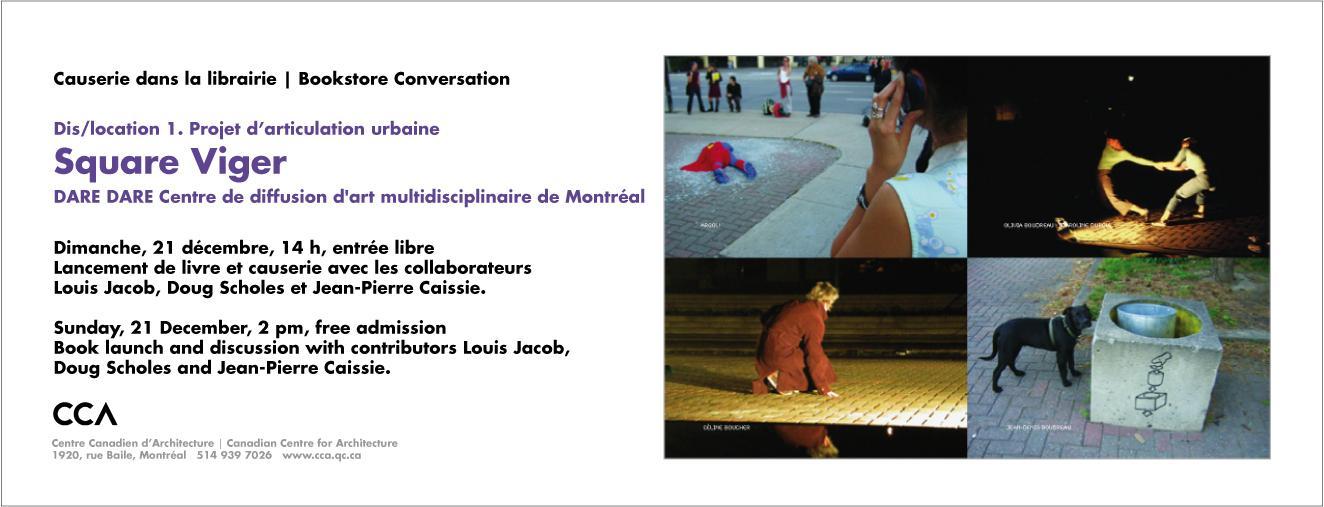 Este libro continúa la reflexión iniciada por los miembros y colaboradores de DARE-DARE con la primera parte de Dis/location: projet d'articulation urbaine, que llevó al centro a trasladar sus oficinas en 2004 a un refugio temporal en la plaza Viger hasta 2006. El libro recorre los principales hitos que condujeron a la realización de esta innovadora iniciativa, mostrando la variedad de prácticas artísticas difundidas y la importancia de las cuestiones planteadas.