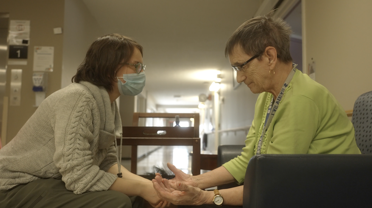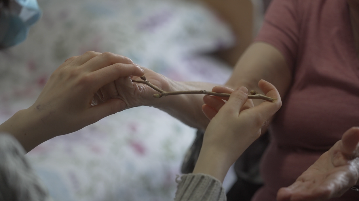 « Une histoire du bout des doigts », c’est d’abord une promenade vers un lieu, un centre pour personnes âgées, c’est une collecte de matières naturelles sur le territoire urbain, c’est une présence pleine de bienveillance...