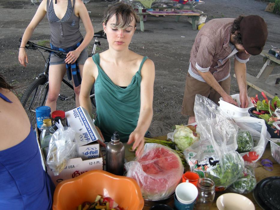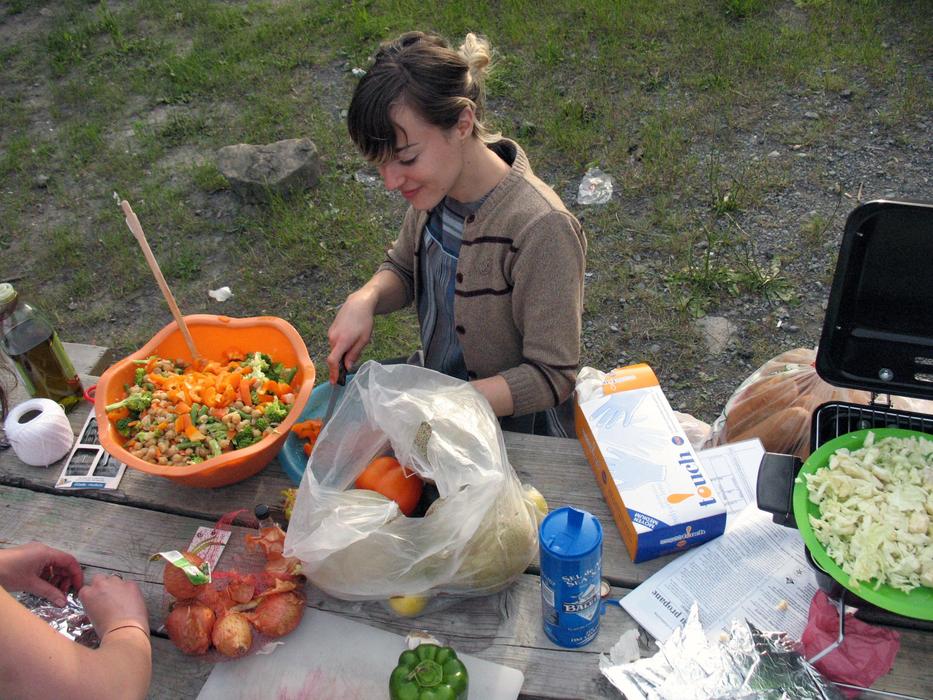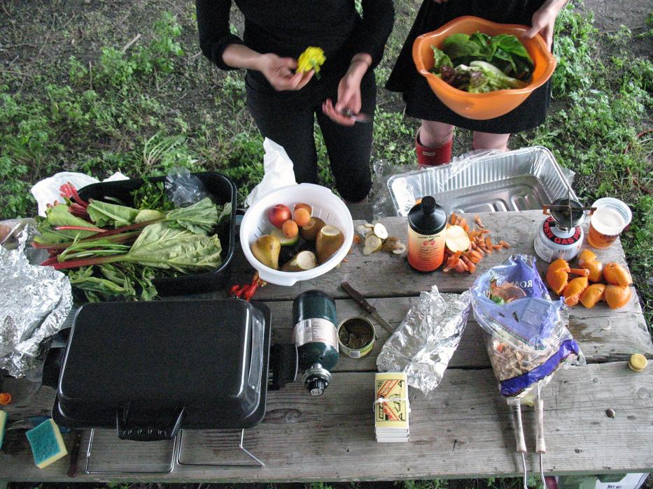 Promenades nutritives dans les environs du camping avec collecte d’aliments dans les rebuts. Élaboration de recettes. Souper en soirée.