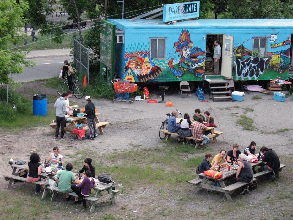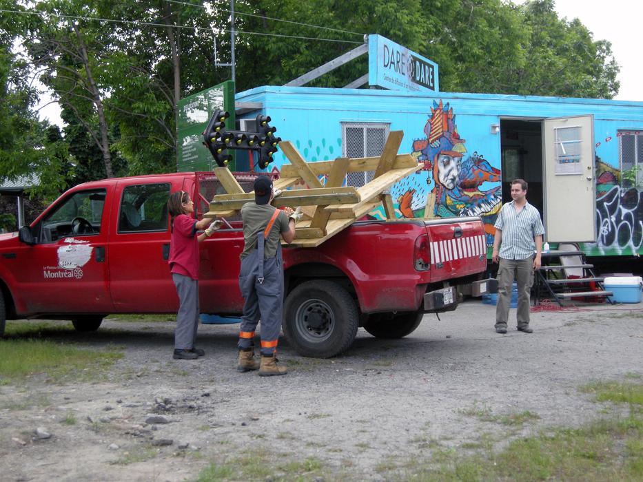 Cette expérience illicite, certes, mais ludique du camping urbain, exploite l’idée du lieu public dans toute sa potentialité et s’inscrit tout à fait dans la continuité de la programmation Dis/location : projet d’articulation urbaine de DARE-DARE, qui interroge les possibilités d’occupation artistique du territoire dans la trame urbaine. Et si « l’art est un engagement global qui intègre l’environnement, le social, la culture et le politique*», comme le prétend René Derouin, les artistes de l’évènement Camping Aux bons plaisirs fugace, qui se soumettent aux contingences de l’environnement et investissent à rebours l’espace à travers l’expérience du camping urbain, ont sans équivoque accompli ce mandat.
