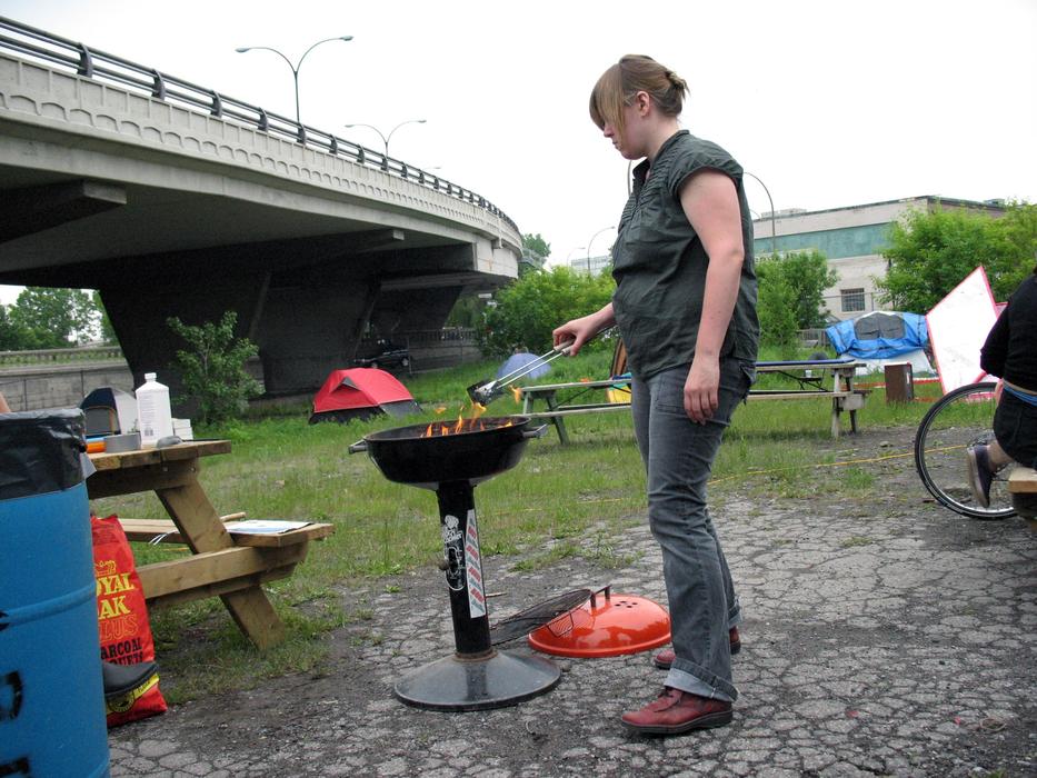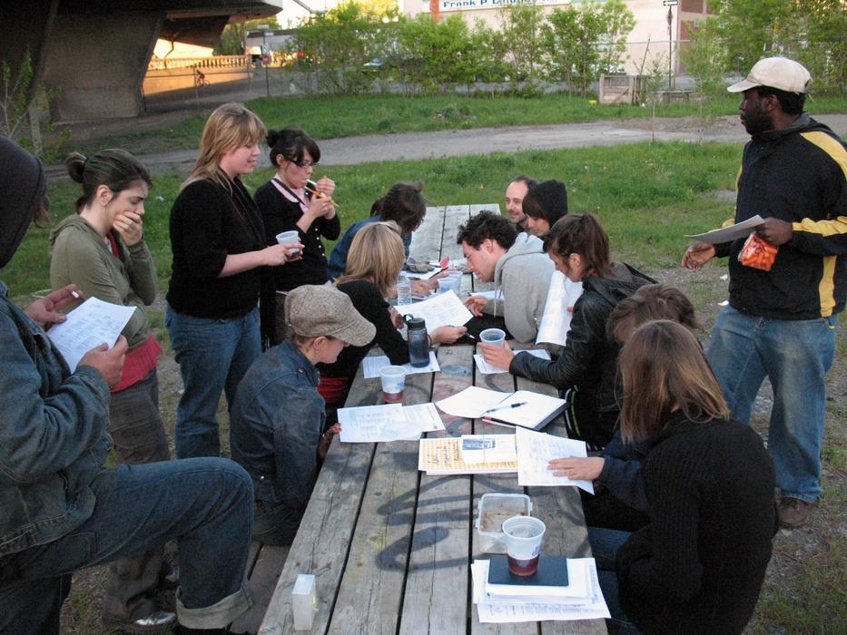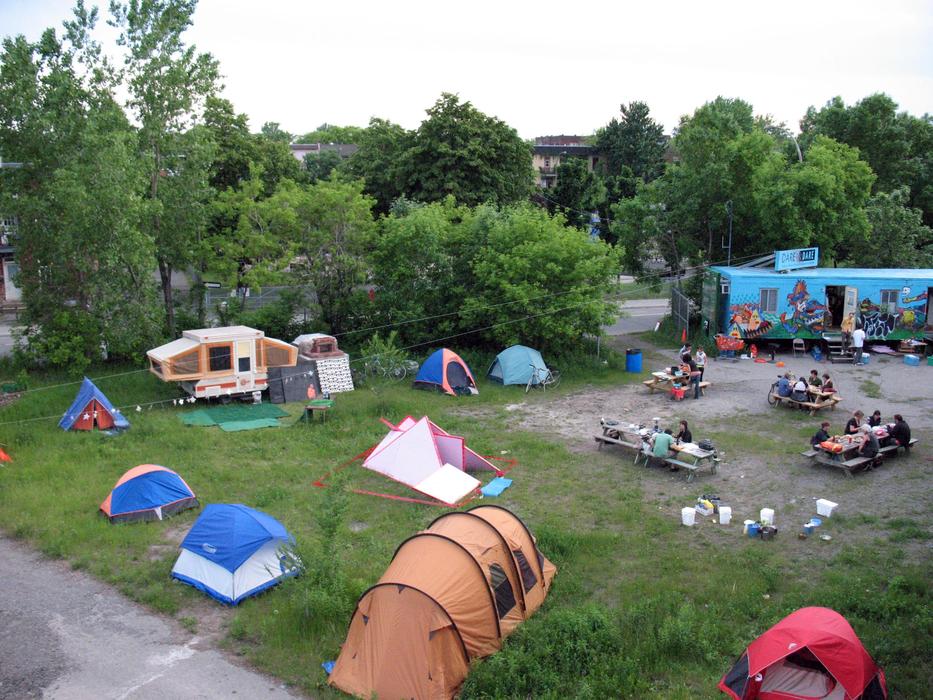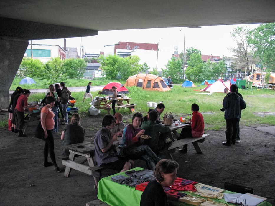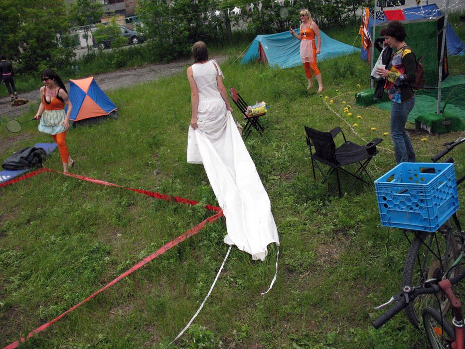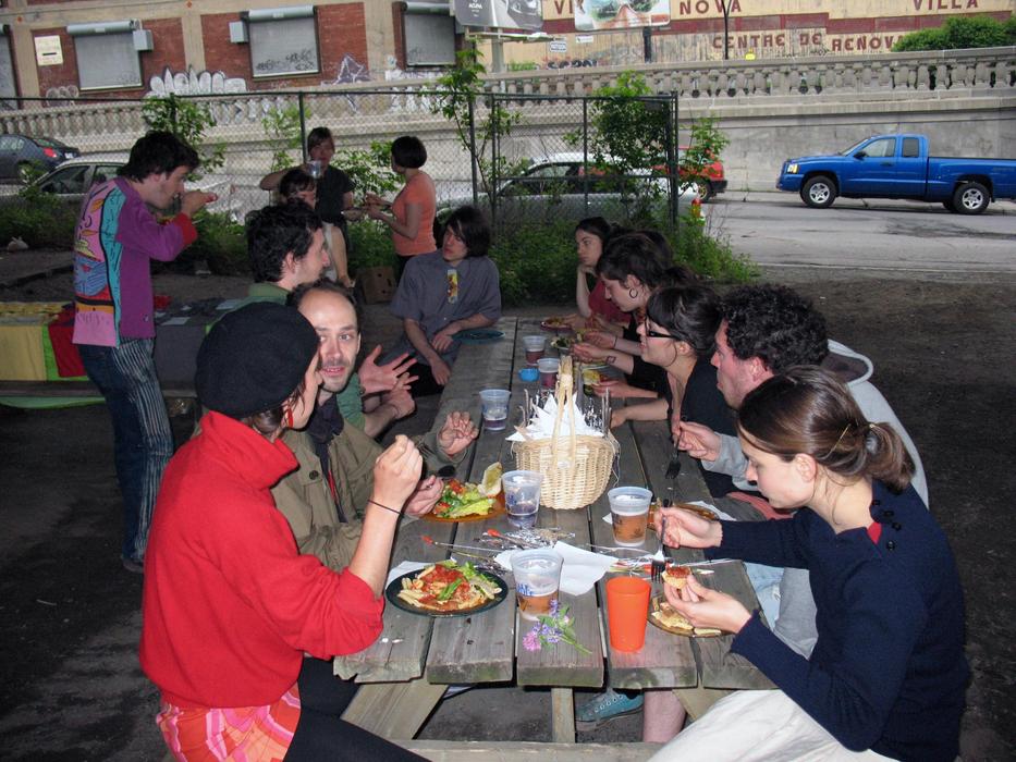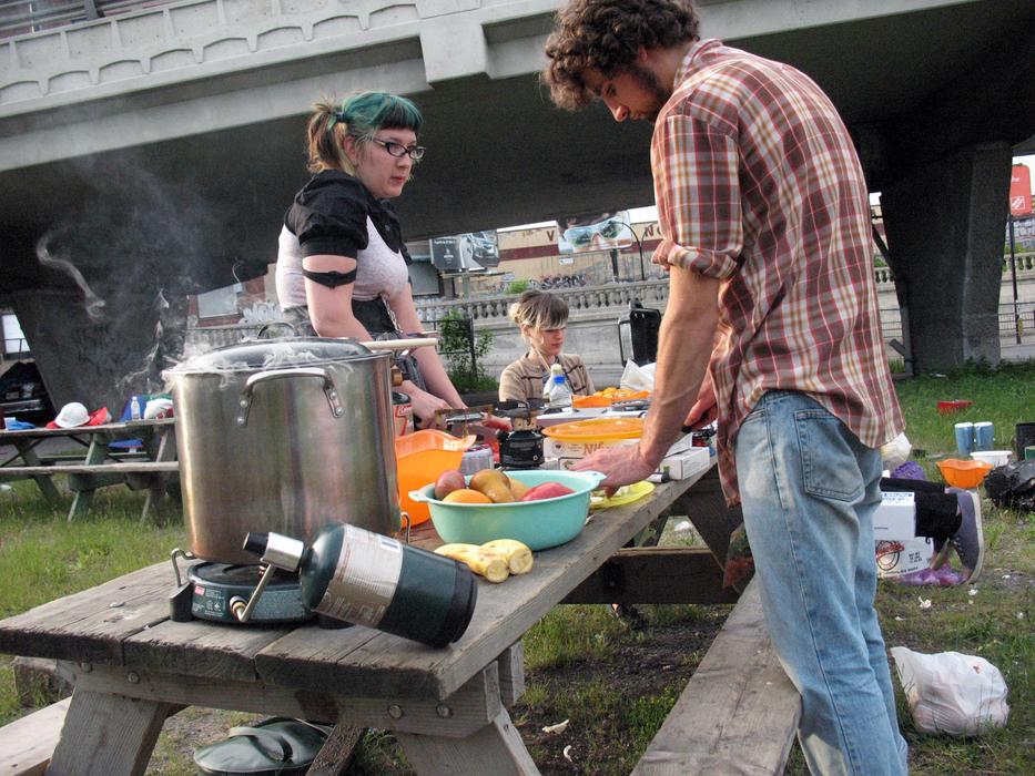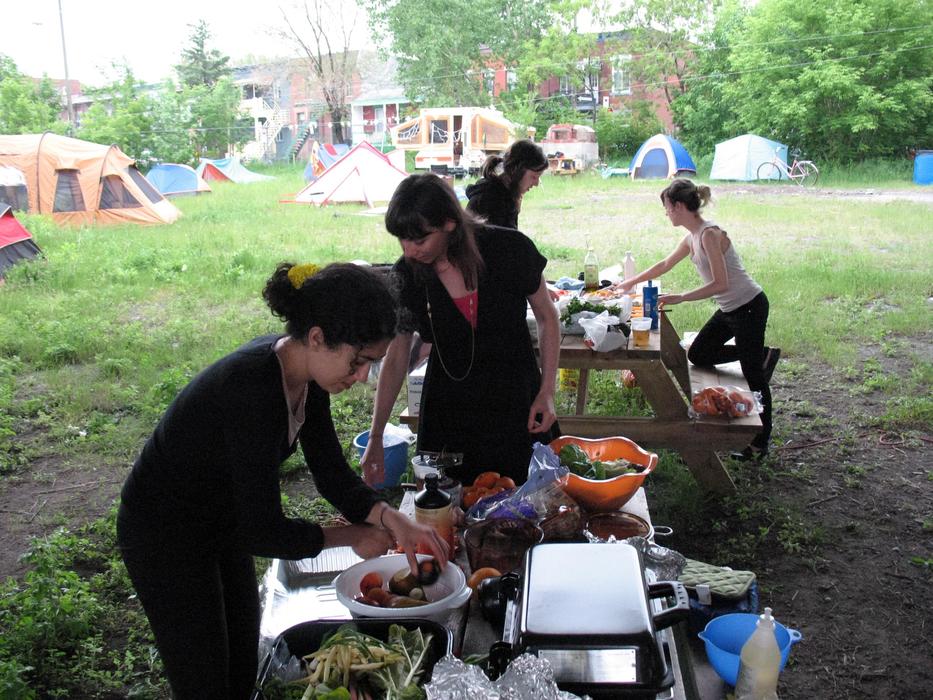 Lieu de repos et de ressourcement, le camping est aussi l’occasion de randonnées pédestres en forêt. Avec Promenade d’écoute de Yannick Guéguen et Edith Normandeau et Eating Your Way Through the Urban Campsite de Aidan Jeffery, les artistes proposent des promenades urbaines pour le moins inusitées. La première a pour objectif d’initier le public au paysage sonore à travers un trajet sensoriel d’expérimentation acoustique aux alentours du parc sans nom. Quelques détours permettent d’expérimenter différentes densités sonores: celle des oiseaux, de la ventilation d’une usine, de l’écho des voitures, du gravier sous nos pieds et des frottements de vêtements, par exemple. Force est de constater que le paysage visuel de la ville influence l’univers sonore qui nous entoure. De retour au campement d’Audiotopie (www.audiotopie.org), les participants sont invités à dessiner une partition à partir des sons entendus : étaient-ils rugueux, fluides, vaporeux? On réalise alors que les sons aussi ont une texture. La seconde promenade (de Aidan Jeffery) est un parcours pédestre préétabli en quête de nourriture dans les rebus des commerces du quartier Mile-End. Les campeurs urbains doivent ainsi s’approvisionner dans l’abondance « naturelle » qu’offre la ville, engageant une réflexion à la fois sur les stratégies de survie et les innombrables pertes associées aux modes de surconsommation qui régissent nos sociétés contemporaines. Comme les repas sont aussi prétextes aux rassemblements, les soupers sont préparés chaque jour collectivement avec les aliments «cueillis» dans le paysage urbain.