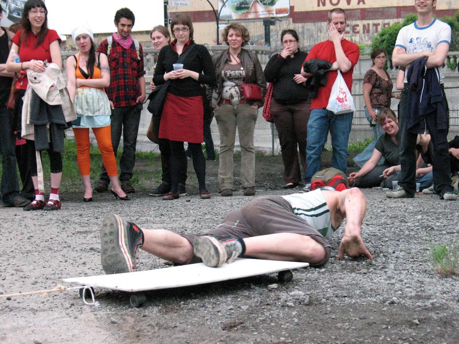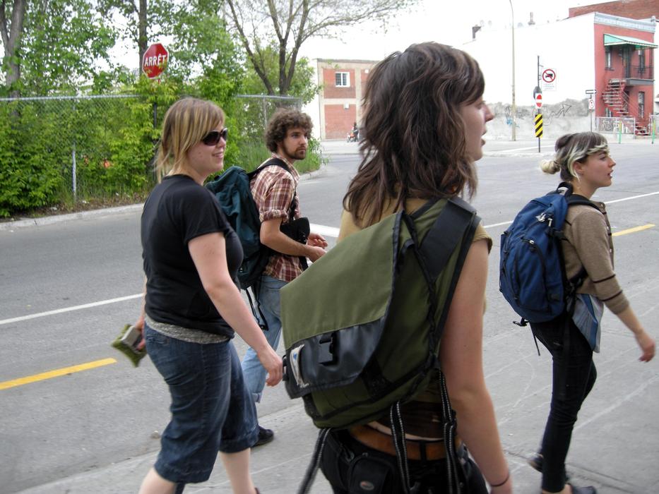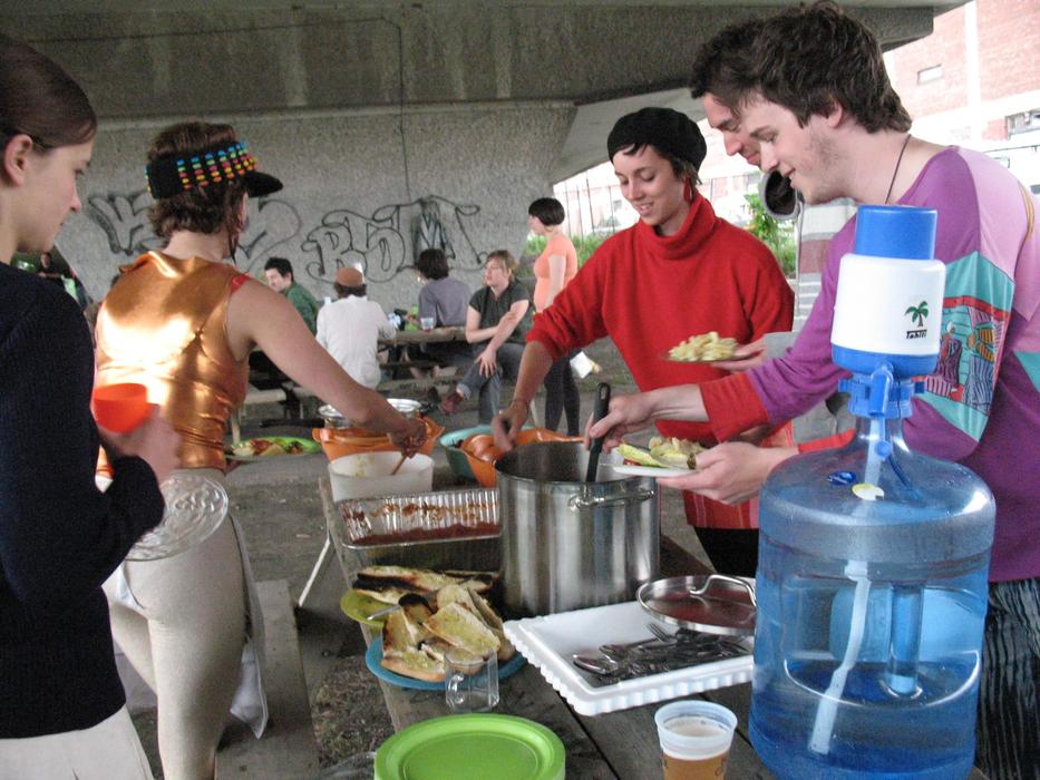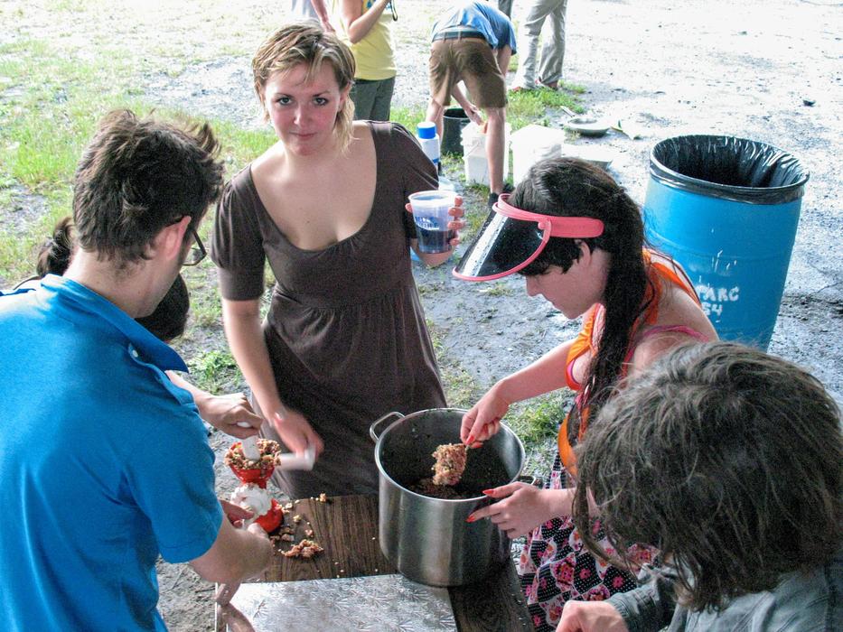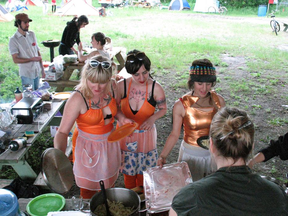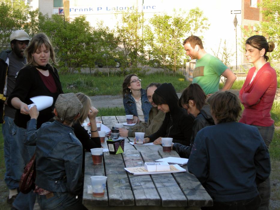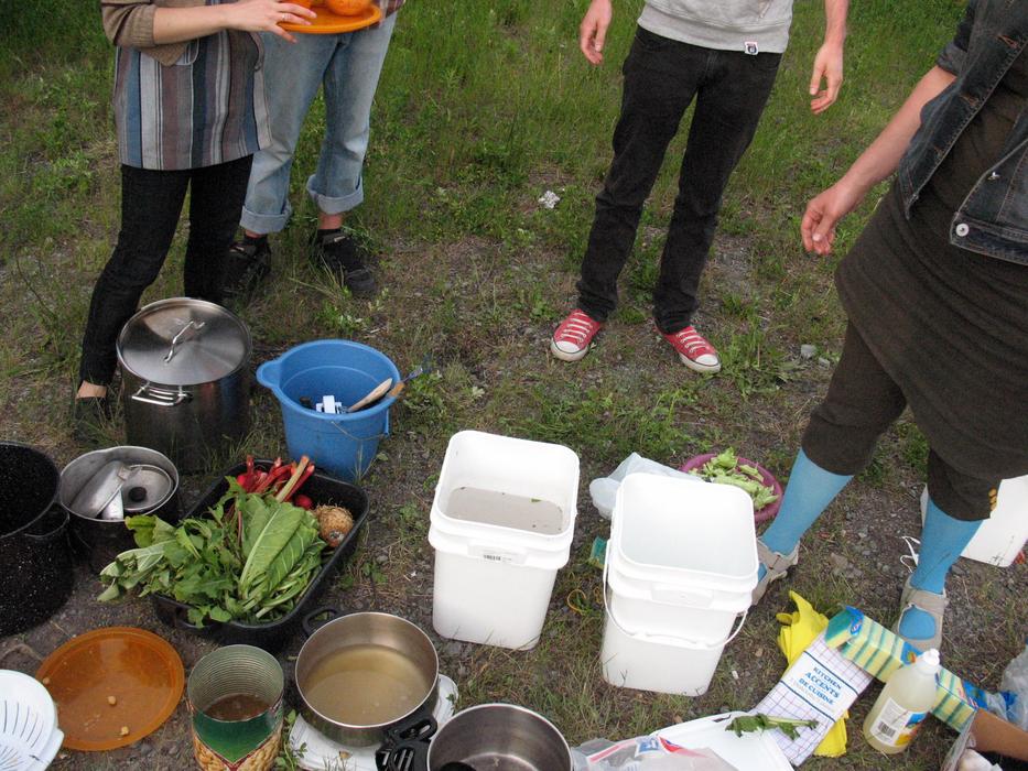 Lieu de repos et de ressourcement, le camping est aussi l’occasion de randonnées pédestres en forêt. Avec Promenade d’écoute de Yannick Guéguen et Edith Normandeau et Eating Your Way Through the Urban Campsite de Aidan Jeffery, les artistes proposent des promenades urbaines pour le moins inusitées. La première a pour objectif d’initier le public au paysage sonore à travers un trajet sensoriel d’expérimentation acoustique aux alentours du parc sans nom. Quelques détours permettent d’expérimenter différentes densités sonores: celle des oiseaux, de la ventilation d’une usine, de l’écho des voitures, du gravier sous nos pieds et des frottements de vêtements, par exemple. Force est de constater que le paysage visuel de la ville influence l’univers sonore qui nous entoure. De retour au campement d’Audiotopie (www.audiotopie.org), les participants sont invités à dessiner une partition à partir des sons entendus : étaient-ils rugueux, fluides, vaporeux? On réalise alors que les sons aussi ont une texture. La seconde promenade (de Aidan Jeffery) est un parcours pédestre préétabli en quête de nourriture dans les rebus des commerces du quartier Mile-End. Les campeurs urbains doivent ainsi s’approvisionner dans l’abondance « naturelle » qu’offre la ville, engageant une réflexion à la fois sur les stratégies de survie et les innombrables pertes associées aux modes de surconsommation qui régissent nos sociétés contemporaines. Comme les repas sont aussi prétextes aux rassemblements, les soupers sont préparés chaque jour collectivement avec les aliments «cueillis» dans le paysage urbain.